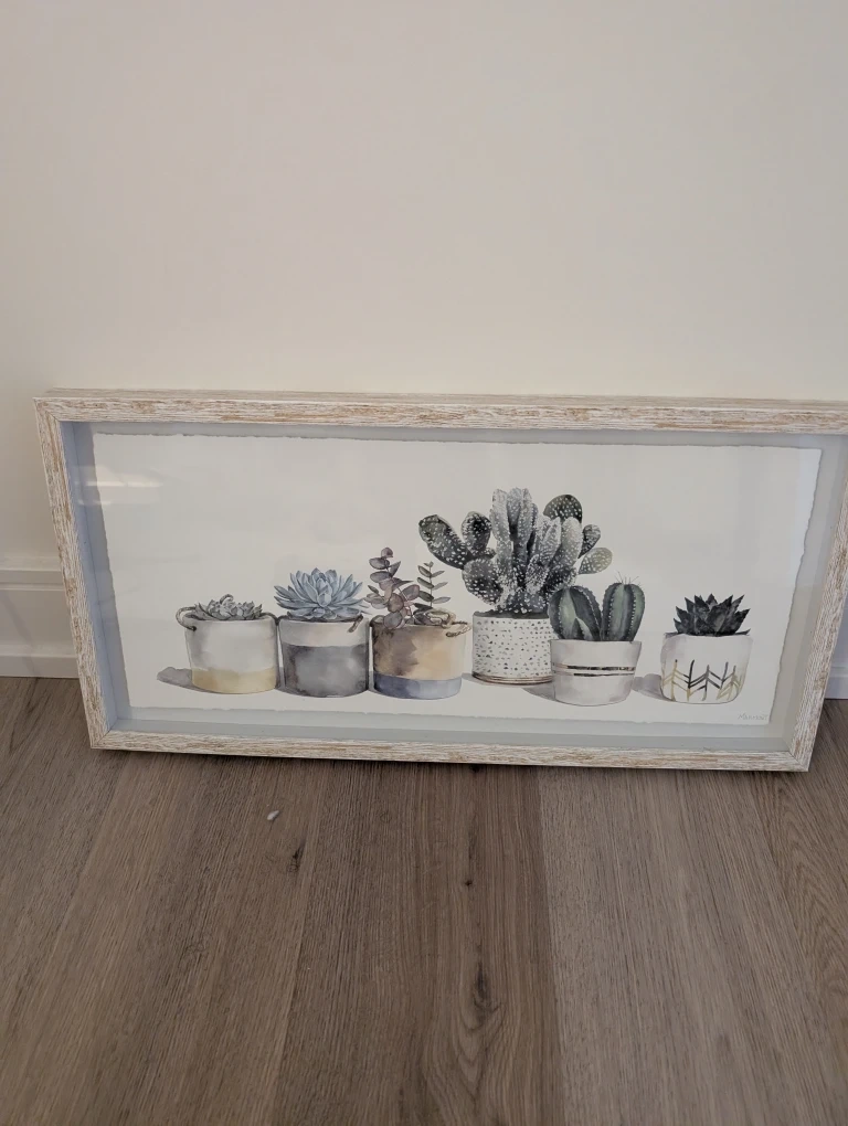 Here's a framed print featuring a lovely arrangement of succulents in pots. It's perfect for adding a touch of greenery to your space without the need for watering! The frame has a nice, neutral tone that would complement many decor styles