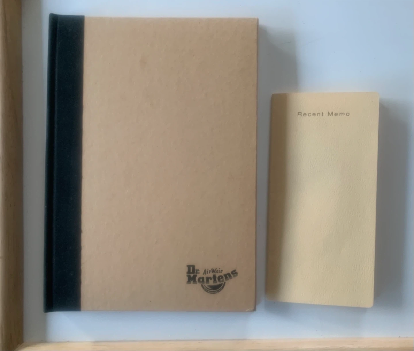 Selling a Dr. Martens notebook. It includes a larger notebook with a black spine and a smaller "Recent Memo" notebook. Great for taking notes or journaling!