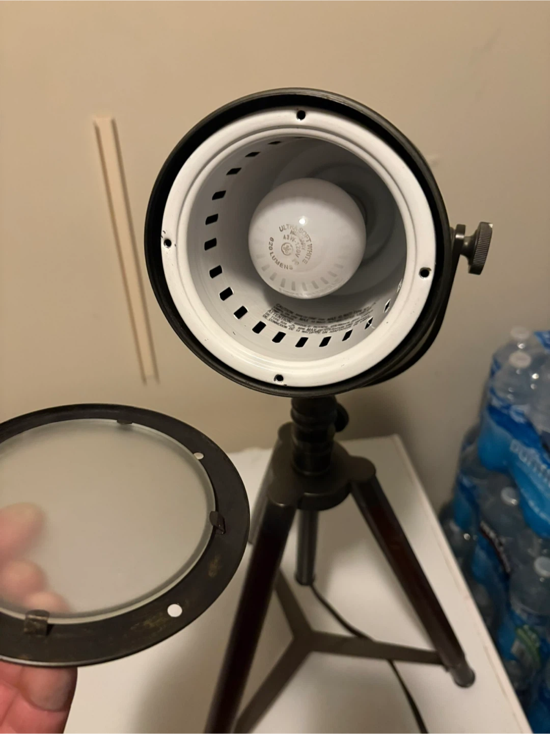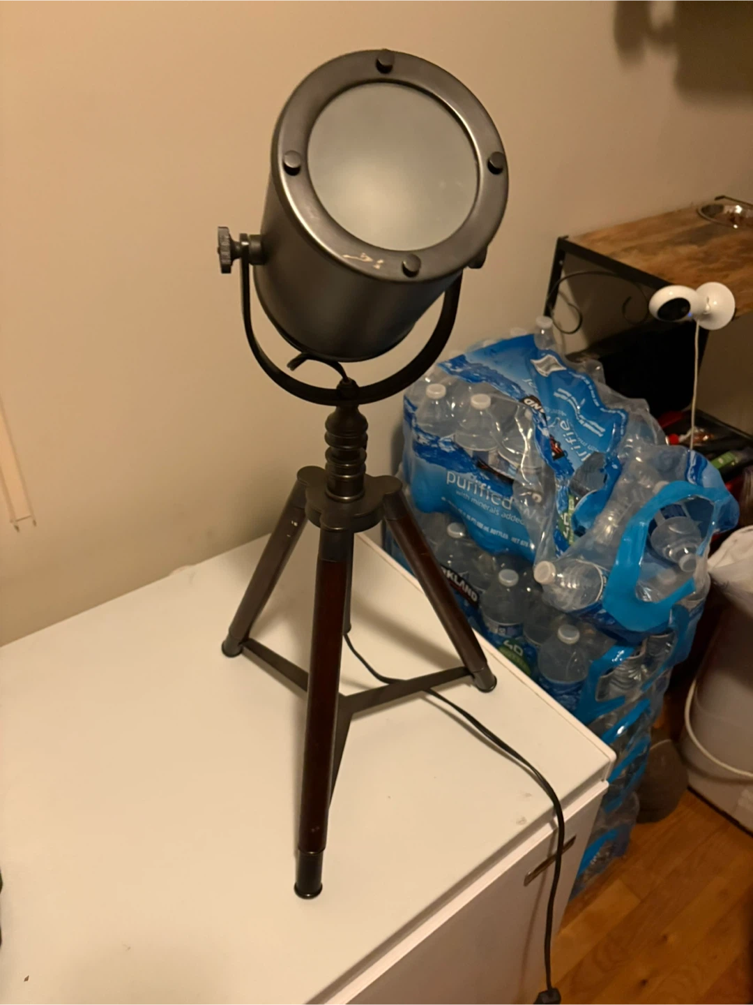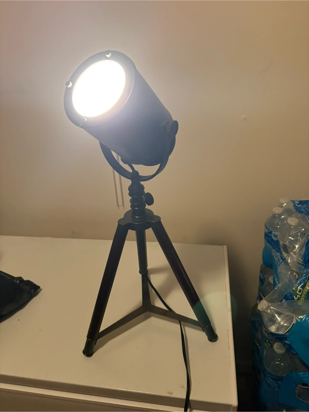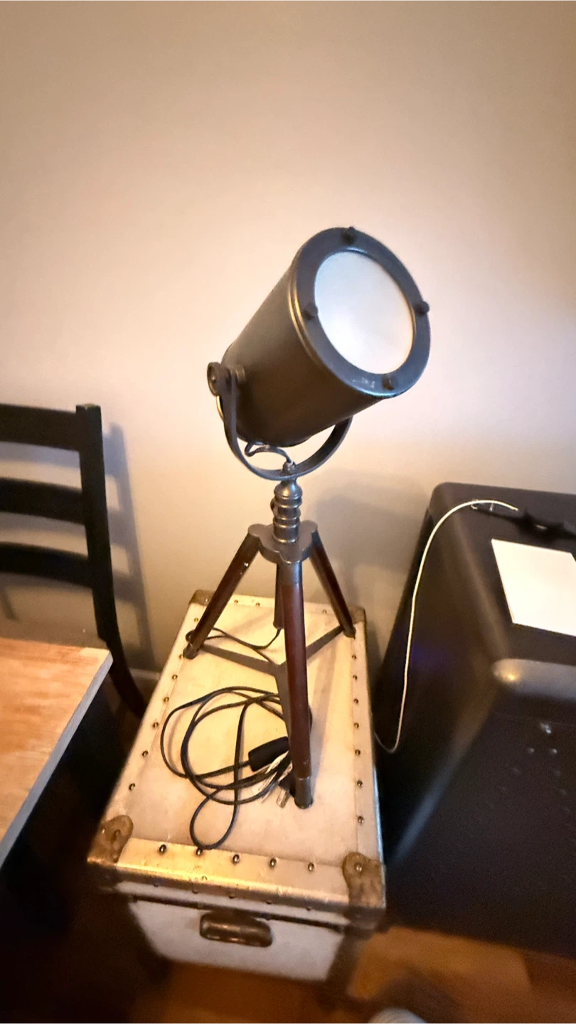 I'm selling a tripod floor lamp. It has a spotlight-style head and a wooden tripod base. The lamp is in good condition and would be a great addition to any room