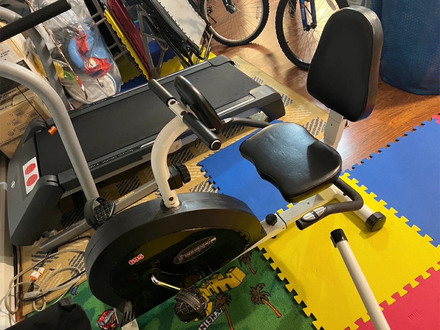 Selling a Free Spirit 695 recumbent bike in great condition- hardly used. It features a display that shows time, calories, pulse, odometer, speed, and distance. Perfect for a home workout!