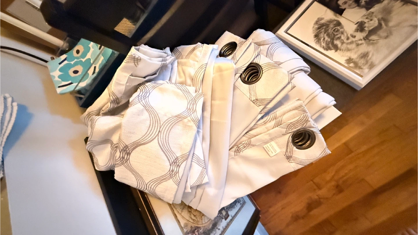 These curtains feature a subtle white and silver color with a modern geometric pattern, adding a touch of elegance to any room. They're in great condition and ready to hang! 4 panels in total