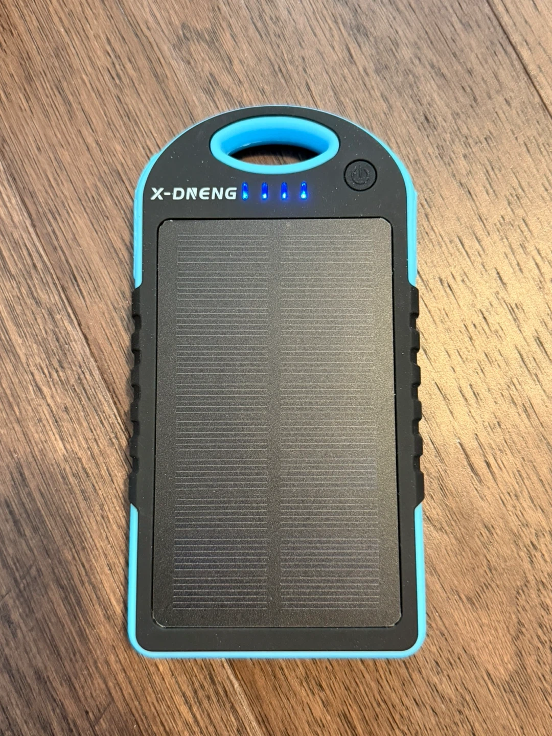 Selling a portable X-DNENG solar power bank. It has a 12000mAh Li-polymer battery and can be charged via solar or DC 5V/1A input. The output is DC 5V/2 x 1A. It has a built in flashlight, two USB ports and the input is your standard charger cable.
