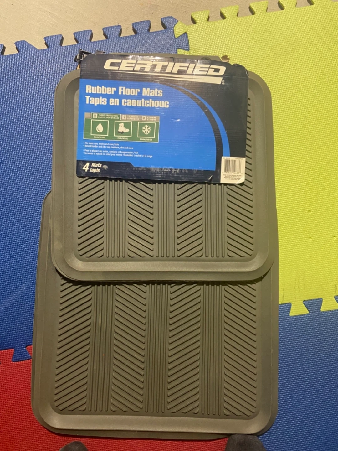 Selling a set of Certified rubber floor mats! These are great for cars, trucks and SUVs. They feature a raised border to keep moisture, dirt and snow contained. You get 4 mats in total
