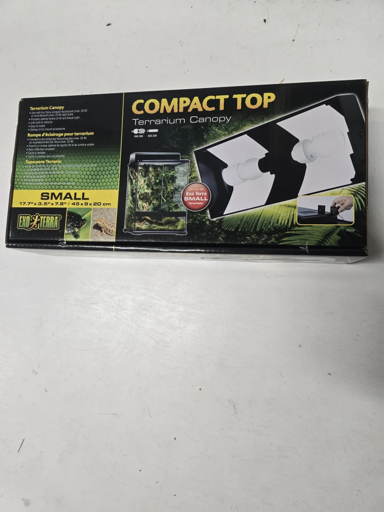 Selling an Exo Terra Compact Top Terrarium Canopy in size small! This terrarium canopy is designed to provide optimal levels of UV and visual light for your reptiles or amphibians. It's easy to install and perfect for creating a natural environment for your pets. Dimensions are 17.7" x 3.5" x 7.8" / 45 x 9 x 20 cm