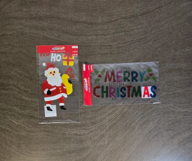 New. Two packs of Christmas gel window clings. One pack has Santa and the other says 'Merry Christmas'. Retail for $5 each. Cross-posted.