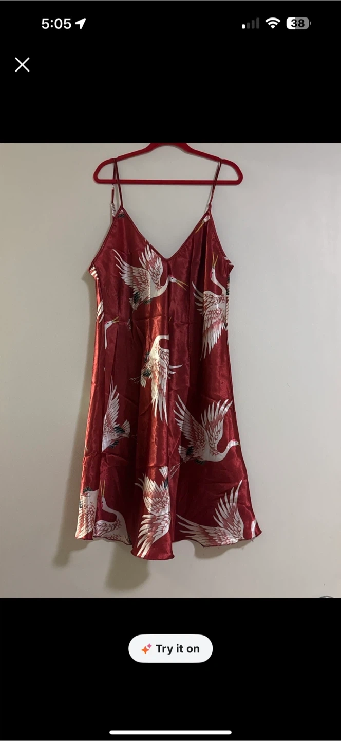 Selling a burgundy satin slip dress with a lovely crane print! It features a V-neck and adjustable straps, with a relaxed fit. Size is Med-Large