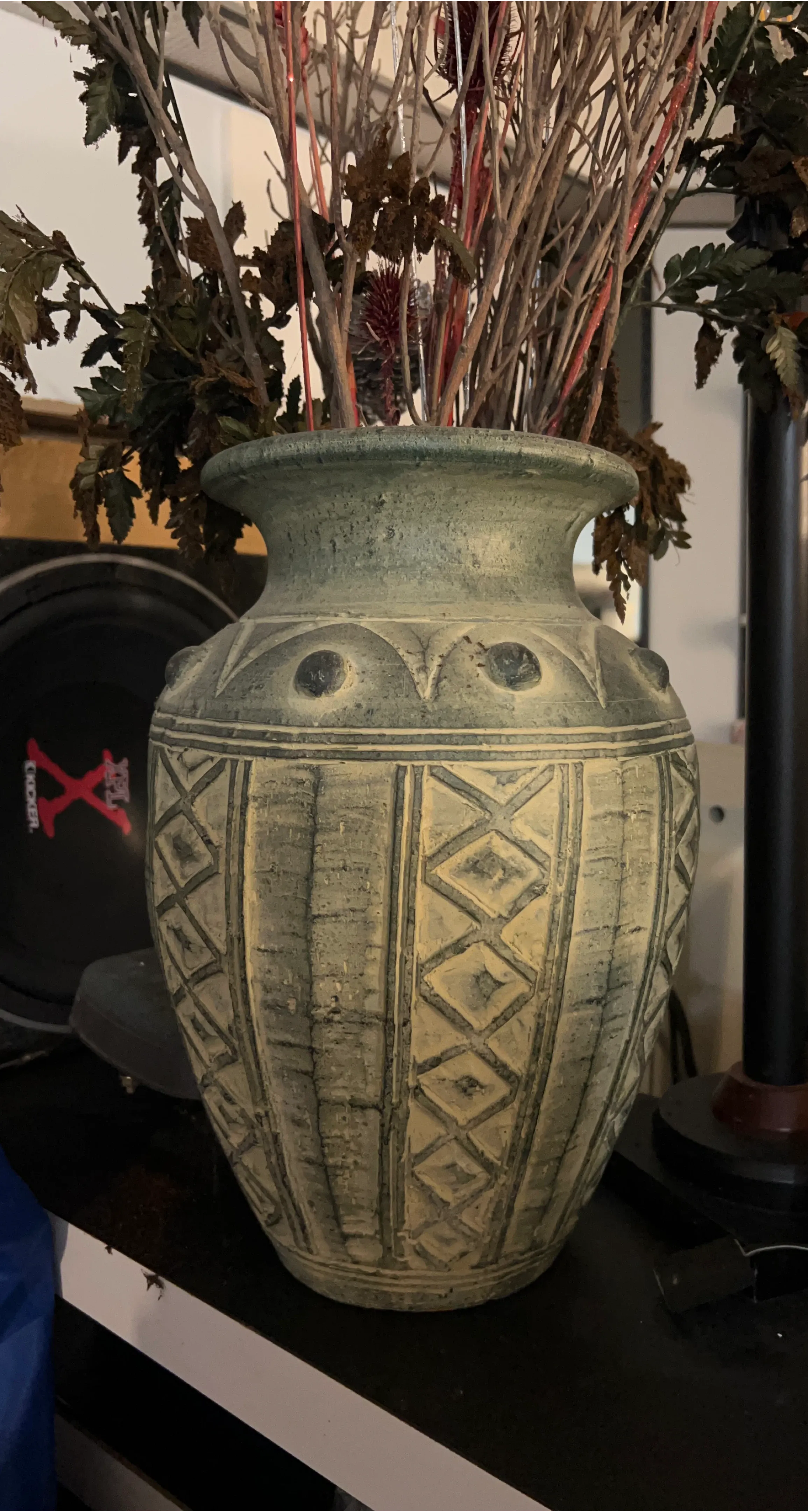 Here's a unique decorative vase, perfect for adding a touch of character to any room! It has a distinct pattern and a lovely, earthy tone
