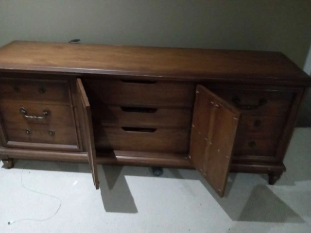 This is a used long dresser, perfect for adding storage and style to any bedroom. The dresser is in good condition, showing some signs of wear consistent with its age, but it remains sturdy and functional. It has drawers and doors for storing your belongings.