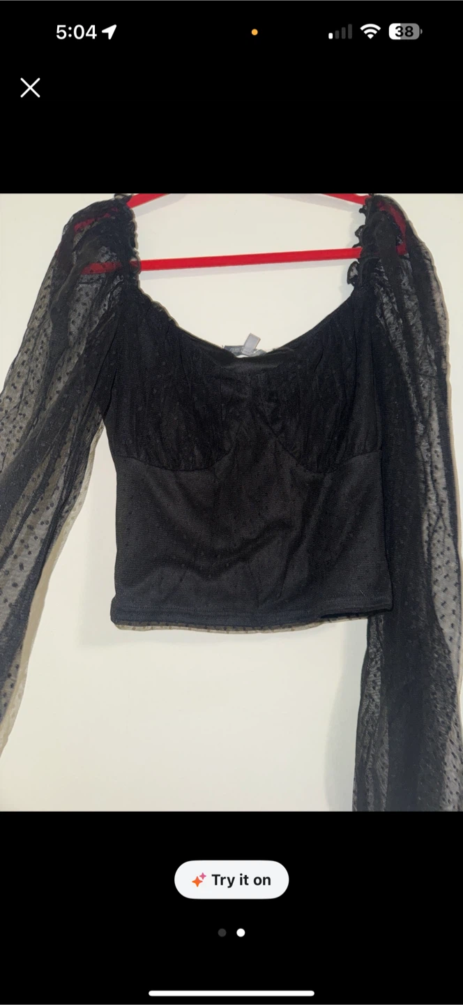 Selling a Charlotte Russe black crop top with a Swiss dotted mesh design! It features adorable long sheer sleeves with subtle puff shoulders and a sweetheart neckline. Made of a soft, stretchy material, perfect for a night out or a casual look. Size small