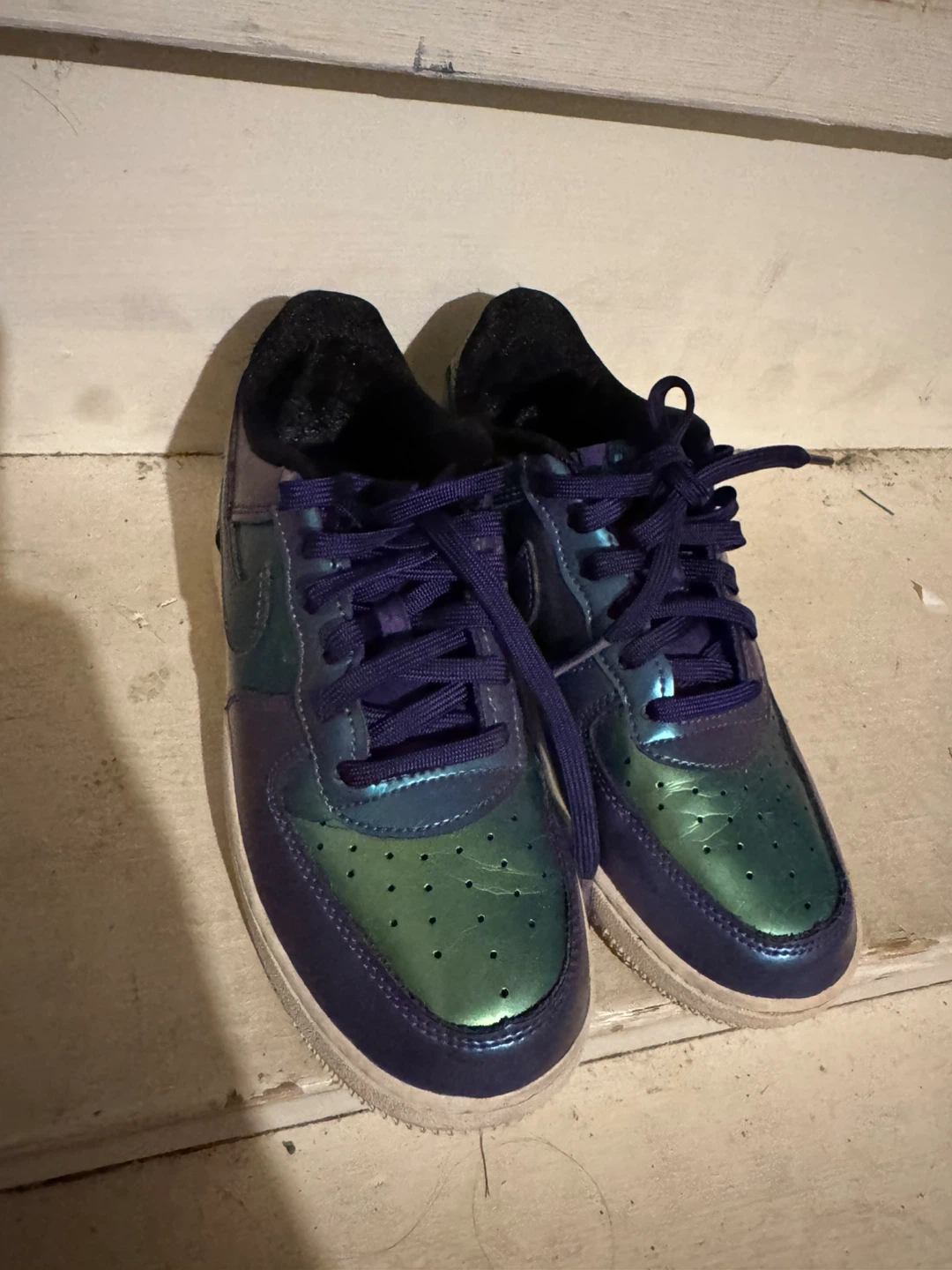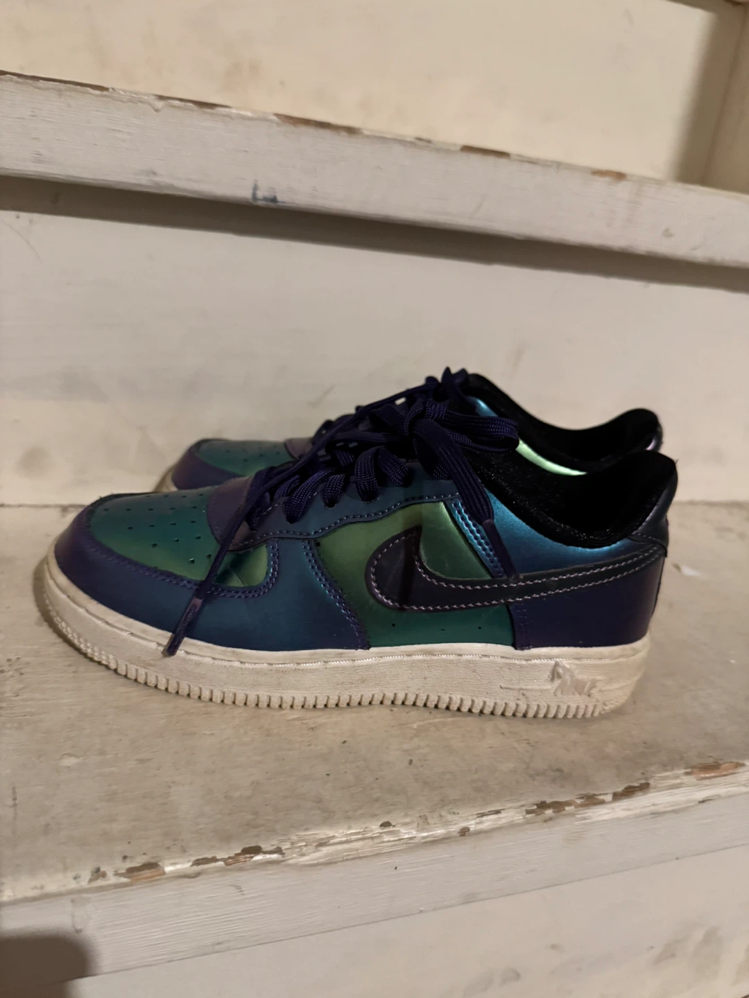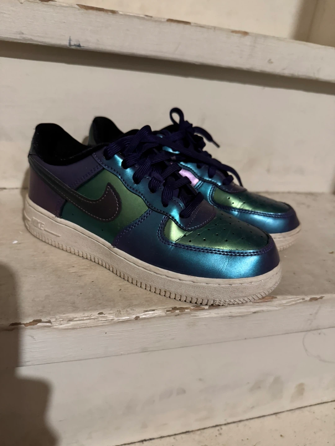 Selling a pair of Nike Air Force 1 kids shoes. They're in good condition and have a cool iridescent colour!