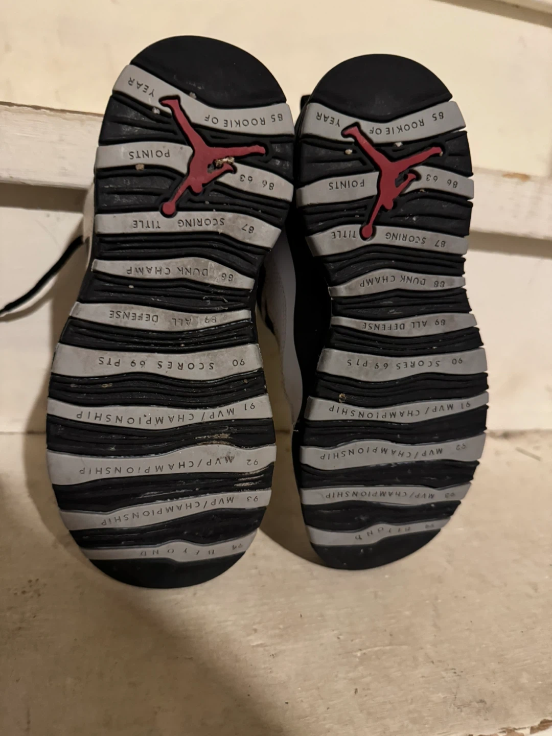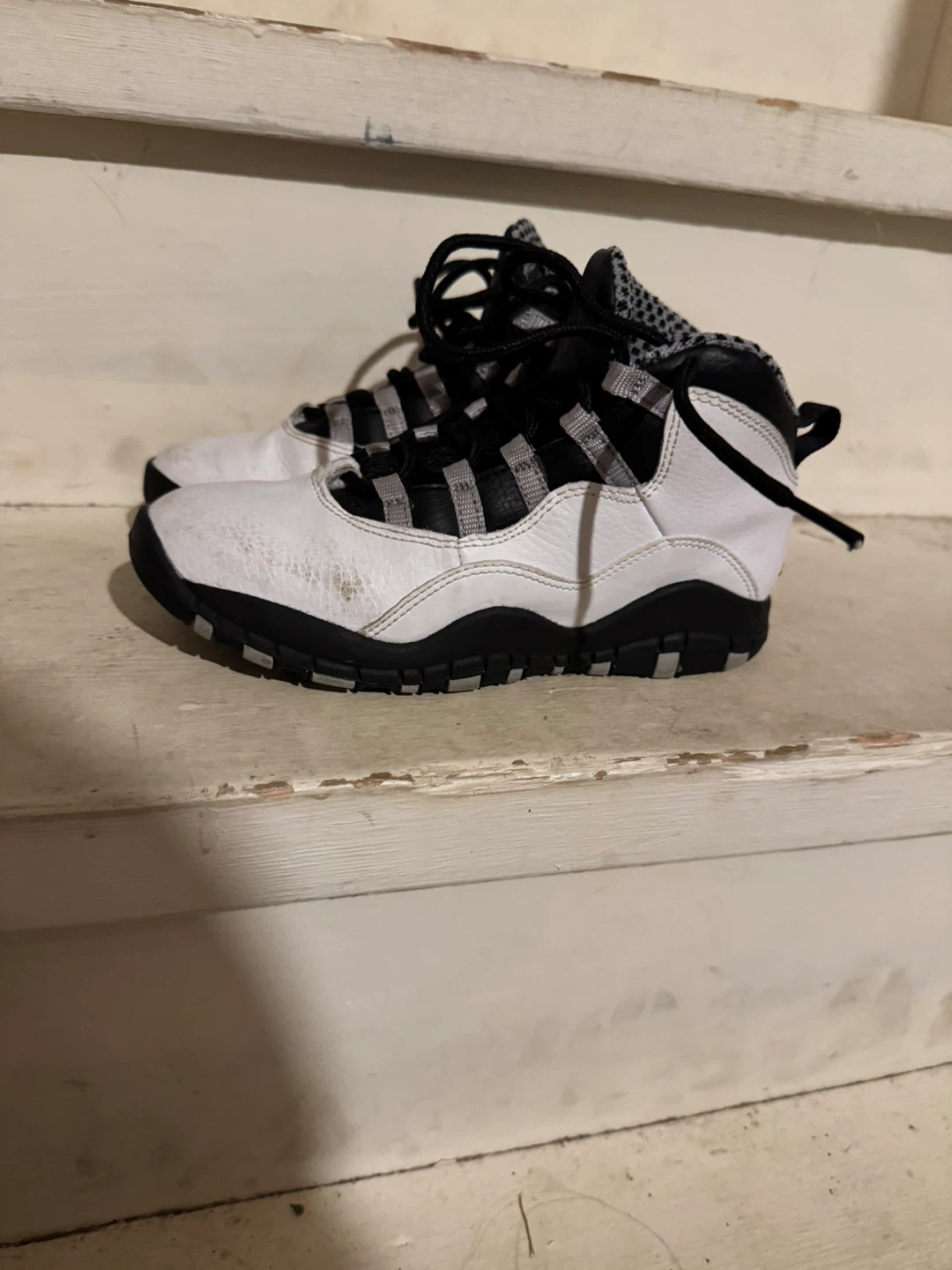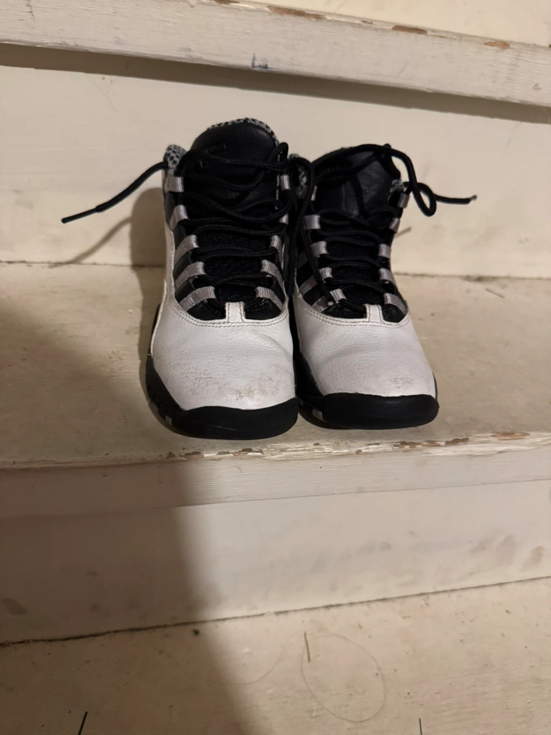 Selling a pair of Air Jordan 10 Retro sneakers in white and black. They're in good condition, perfect for everyday wear or adding to your collection! The iconic Jumpman logo is visible on the back. Check out the photos for details!