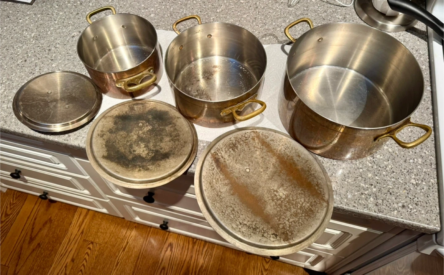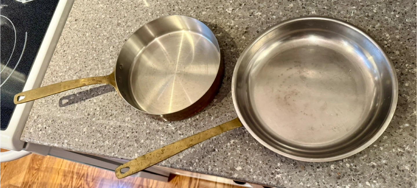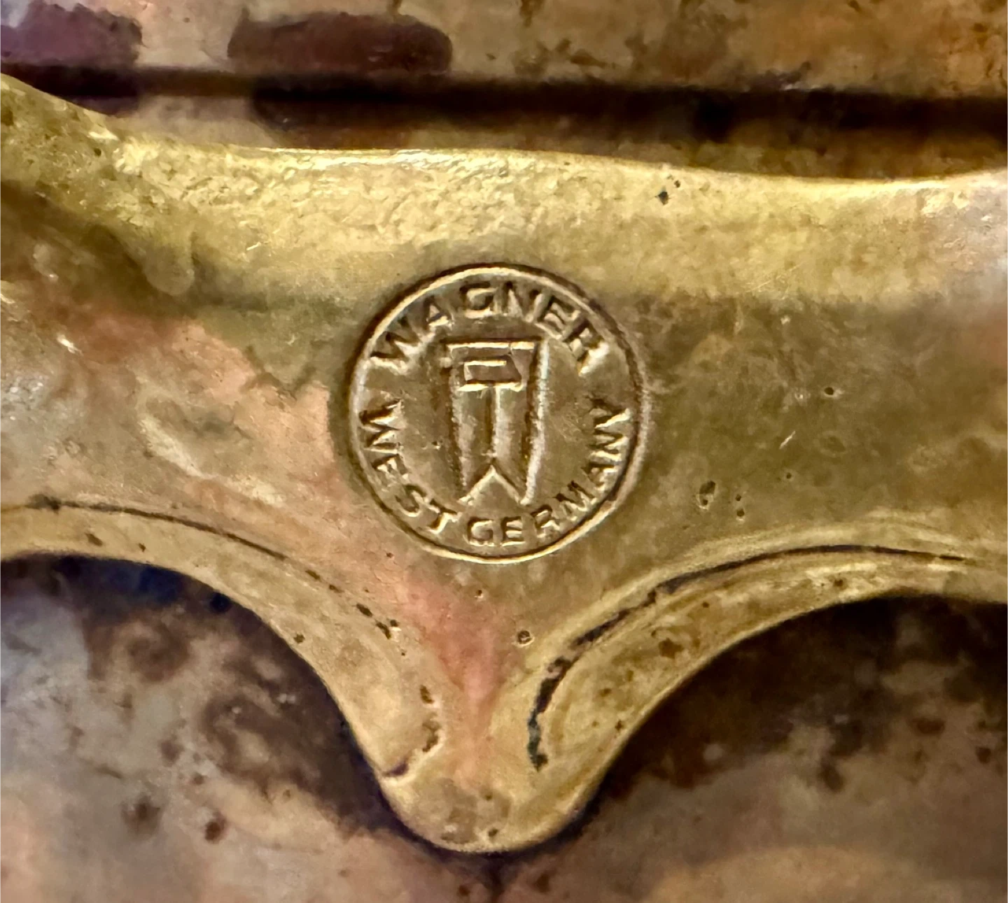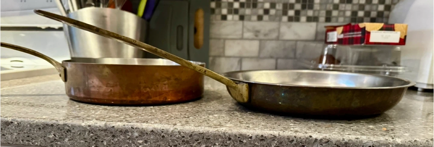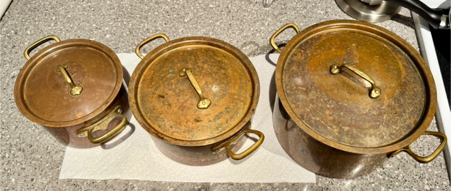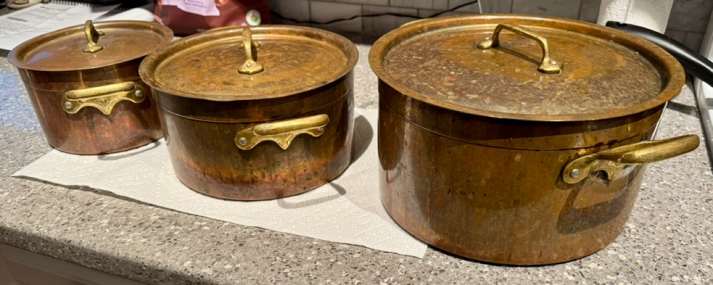 Selling a set of Wagner West Germany copper cookware. The set includes three pots with lids and two frying pans. These are vintage pieces with a beautiful copper finish. They show signs of use and wear, adding to their character. Purchased in London in the 1970s.