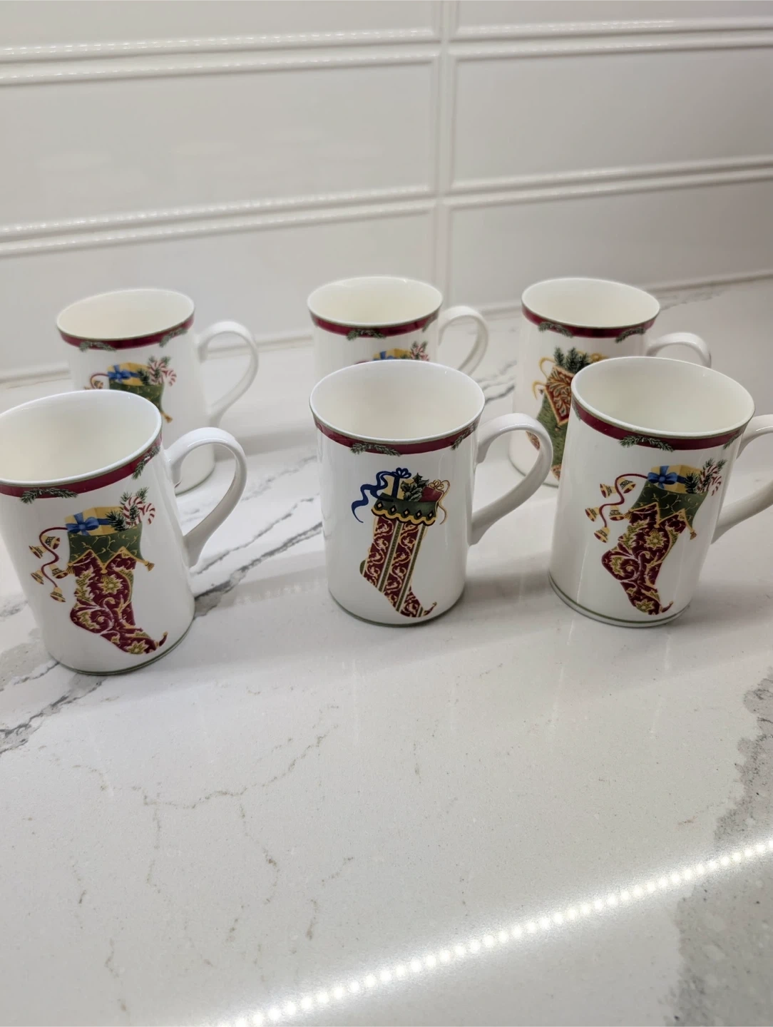 Selling a set of six fine bone china mugs from the Holiday Stockings Collection Series! They're in great shape and feature a festive stocking design. Perfect for adding a touch of holiday cheer to your morning coffee or tea