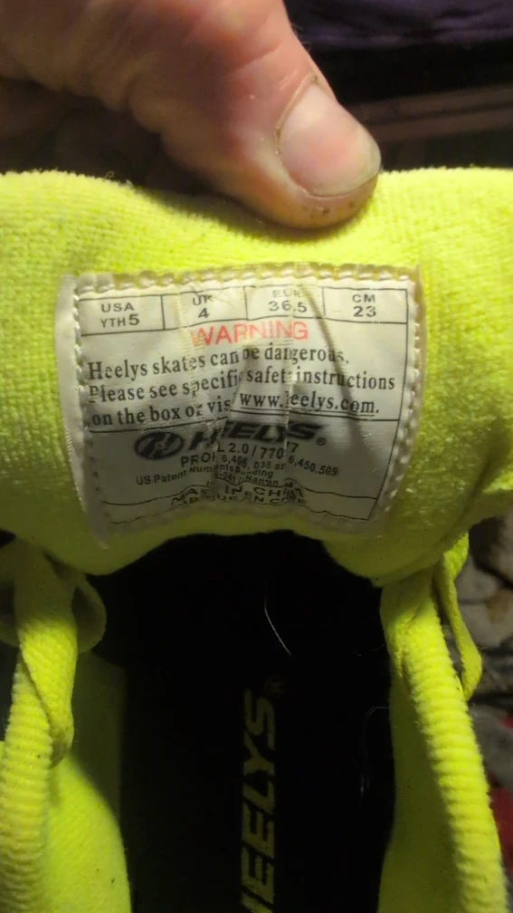 Selling a pair of Heelys roller shoes in youth size 5! They're black with neon yellow accents. The label inside also indicates UK size 4 and EUR size 36.5. They're in good used condition and ready for some fun!