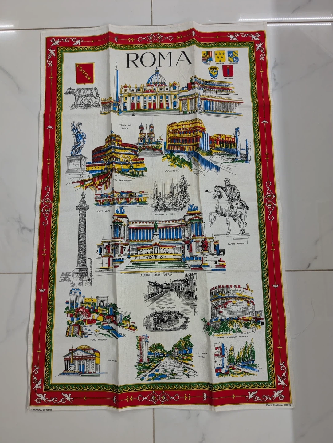Souvenir tea towel featuring iconic landmarks of Roma, Italy! The towel is made of 100% cotton and has a colourful design with a red and green border. Perfect for adding a touch of Italian charm to your kitchen or as a decorative piece