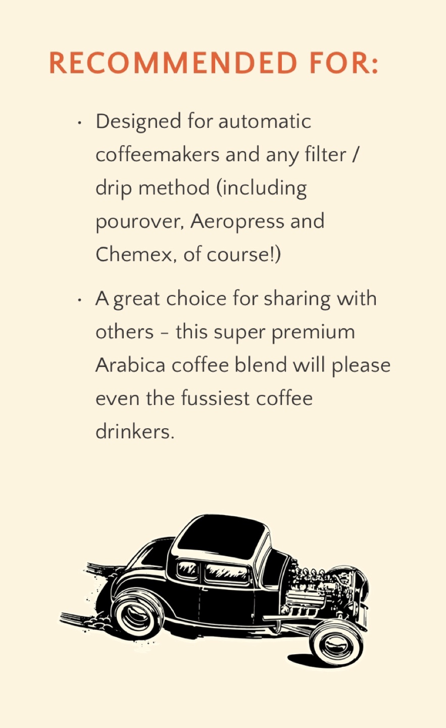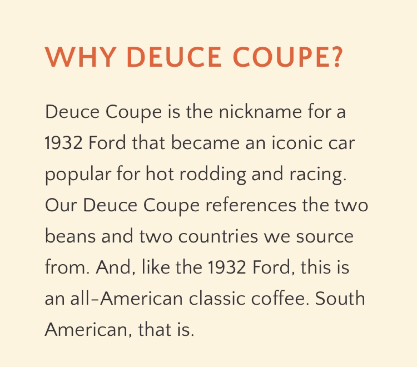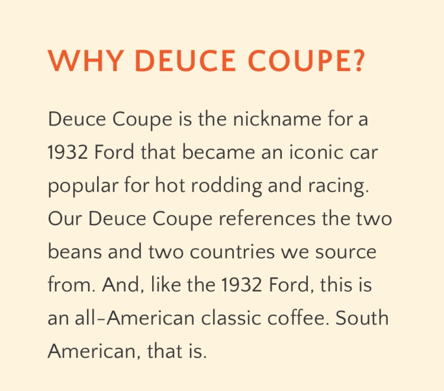 Deuce Coupe is a post roast coffee made up of two directly-traded South American beans.