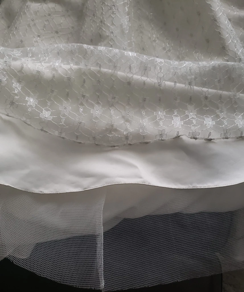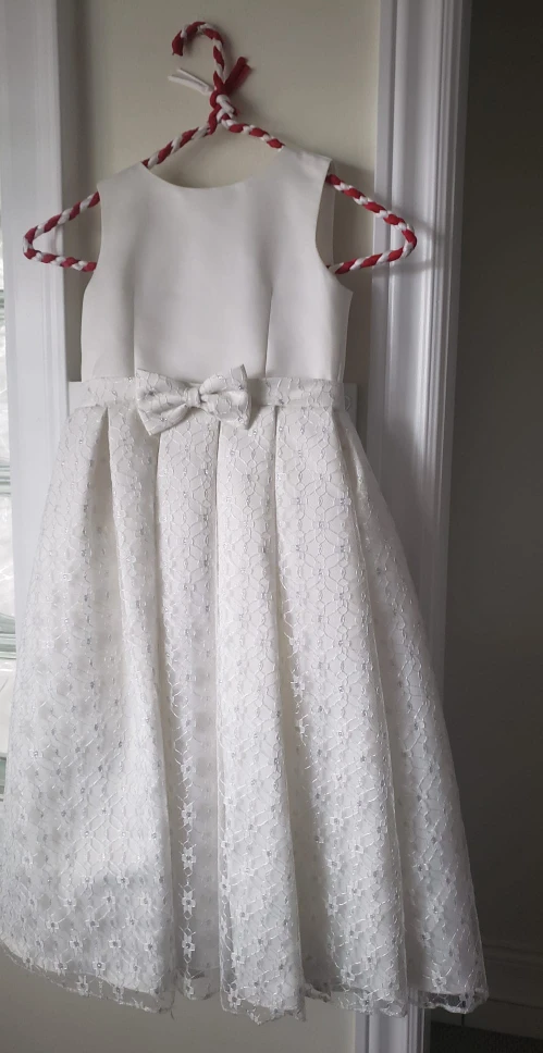 Beautiful Ivory lace flower girl dress made in England. Size 5/6! Features delicate bow with satin and organza overlay skirt.
