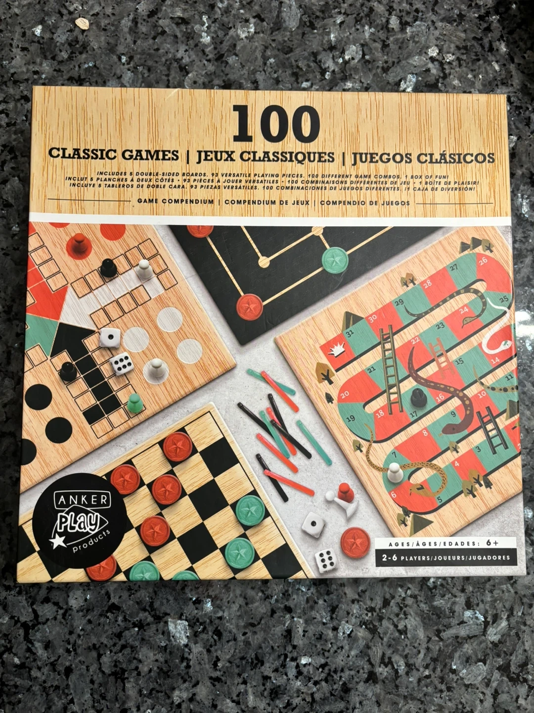 Selling an Anker Play 100 Classic Games compendium! It includes 5 double-sided boards, 93 versatile playing pieces, and 100 different game combos. It's suitable for ages 6+ and 2-6 players
