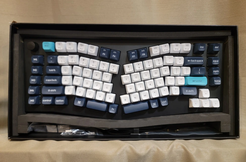 Keychron q10 max tri mode (bluetooth/wired/wireless) mechanical keyboard with rgb and brown hotswappable switches. Box includes manuals, keyboard, dongle/adapters, extra keycaps, screwdriver, hextool, keycap/switch puller, extra screws/feet/etc and cable.
