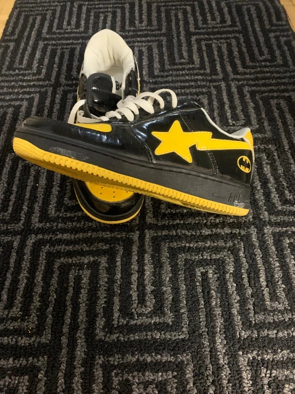 21Selling a pair of BAPE x Batman Bapesta sneakers 8.5 in black and yellow! They're in good condition, with the classic BAPE star logo and Batman symbol. These are a standout piece for any sneakerhead or fan of the Dark Knight