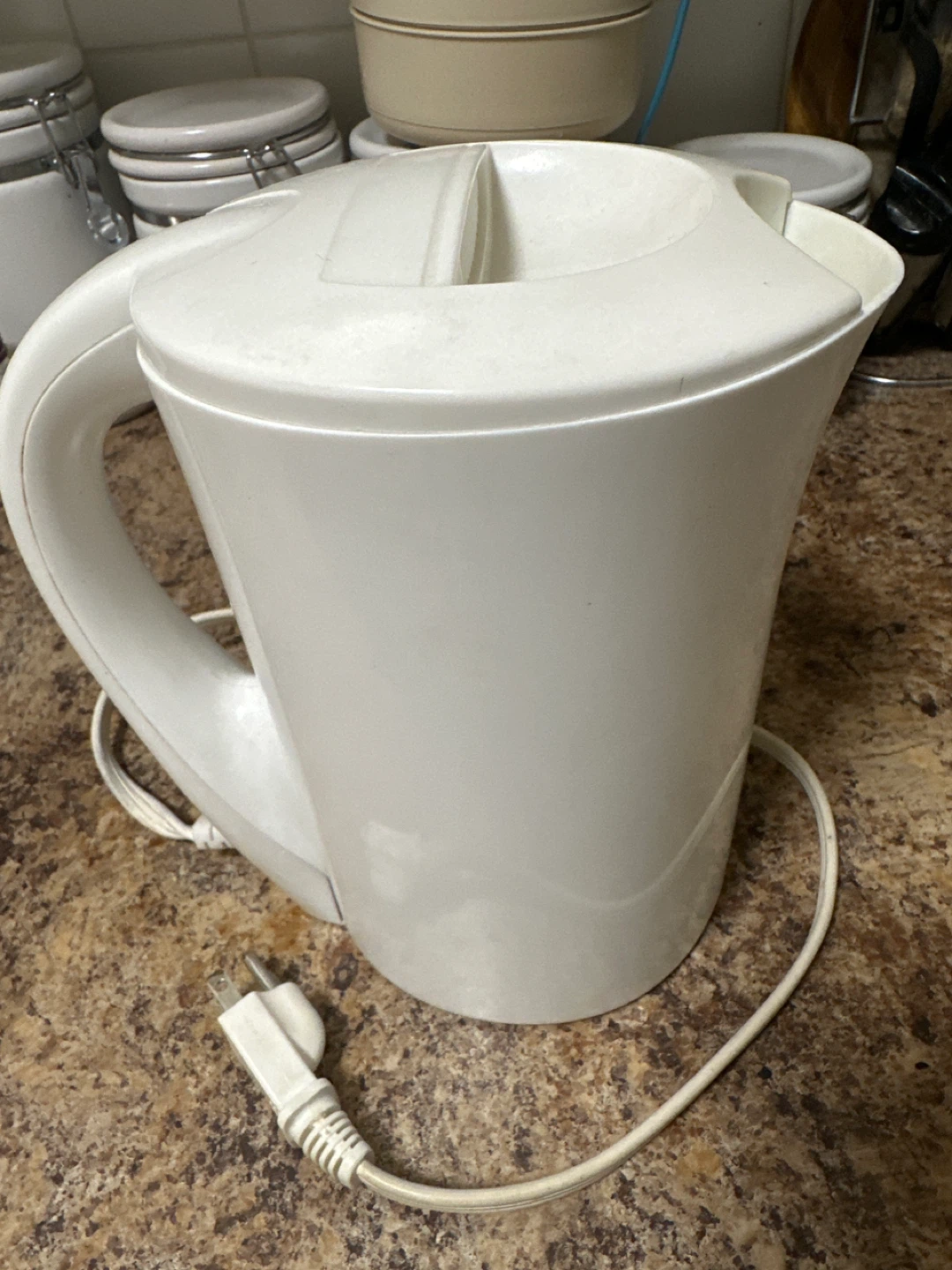 Selling a white electric kettle. It's in great condition and ready to quickly boil water for your tea or coffee. Perfect for any kitchen!, (used)