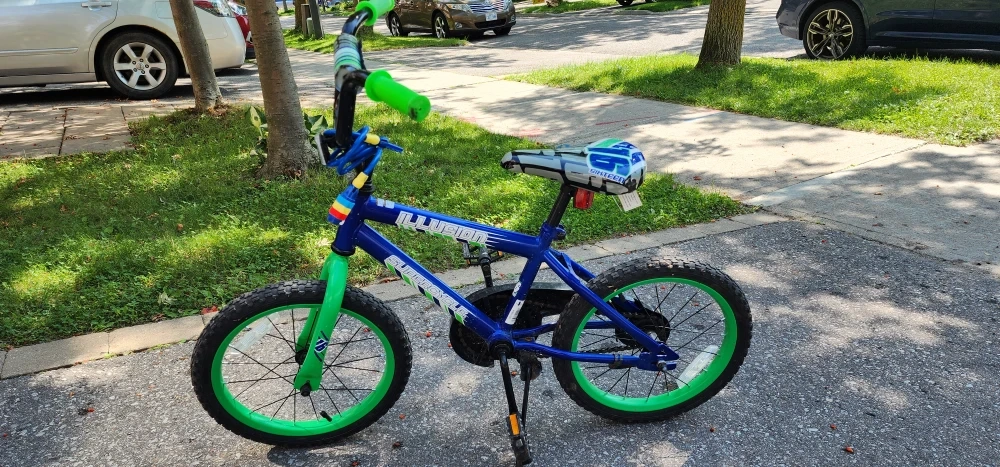 Selling a Supercycle Illusion Sixteen kids' bike in blue and green! It's got some wear and tear on the seat, but it's still a great bike for a young cyclist. Perfect for learning to ride!