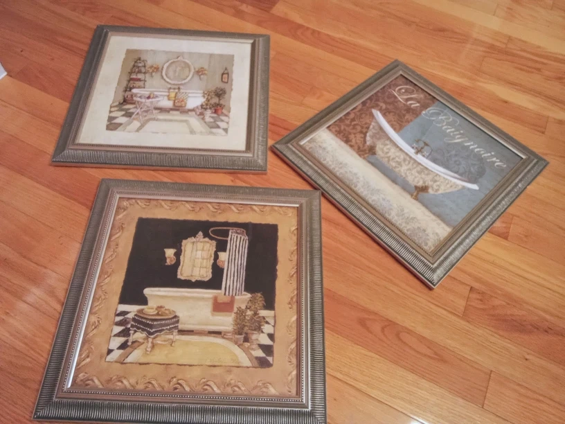 Selling a set of three framed prints featuring bathroom scenes. These prints would be a charming addition to any bathroom decor!