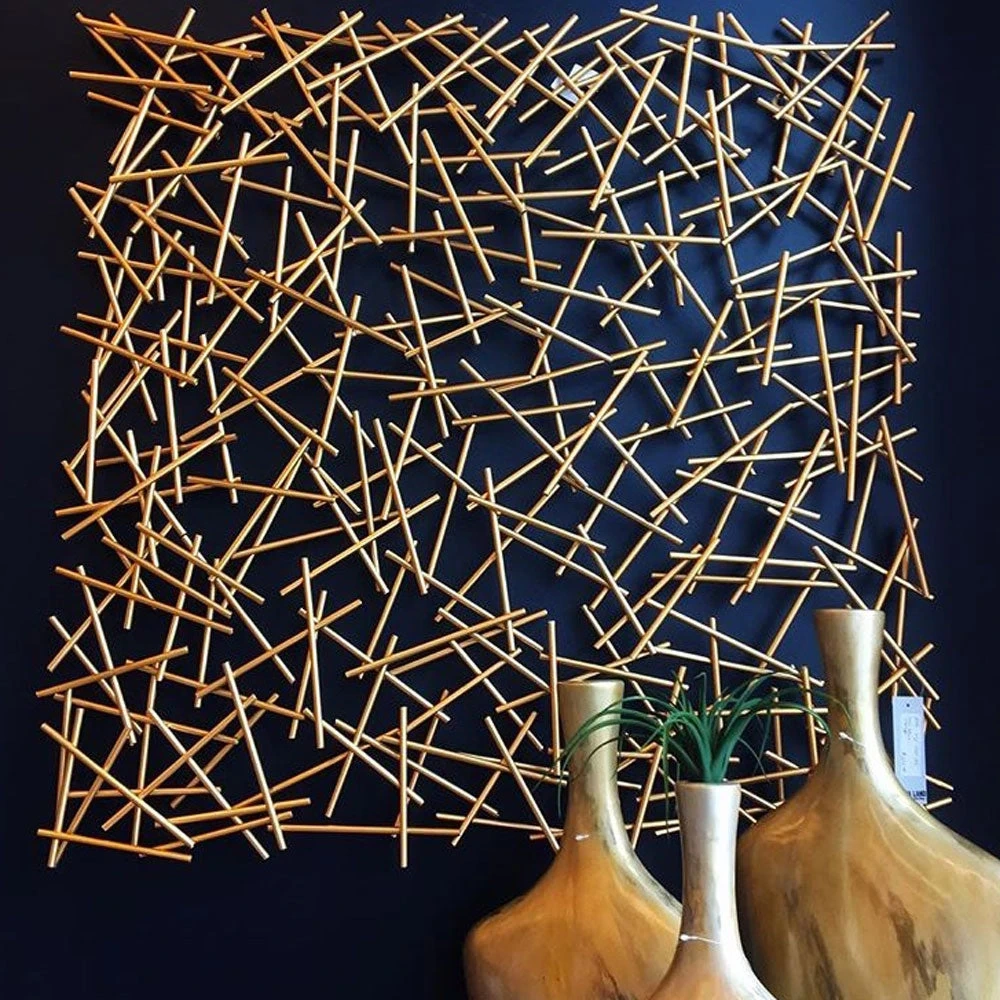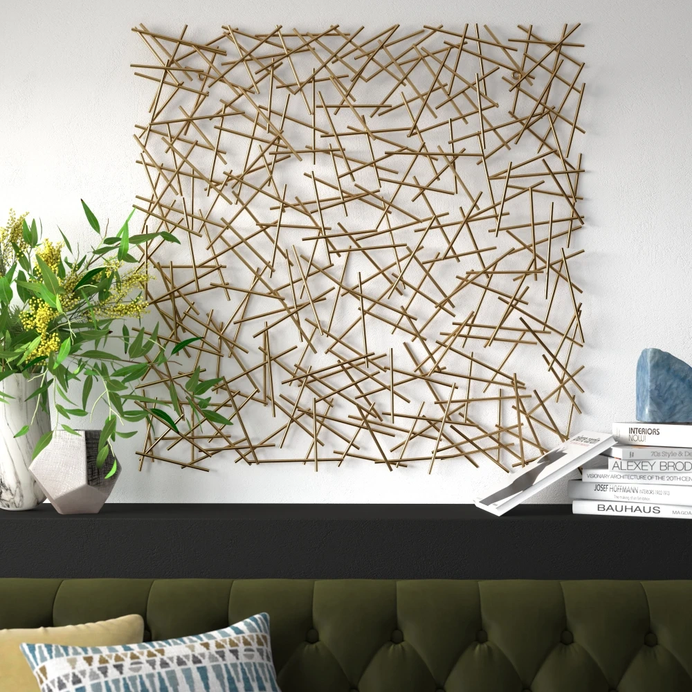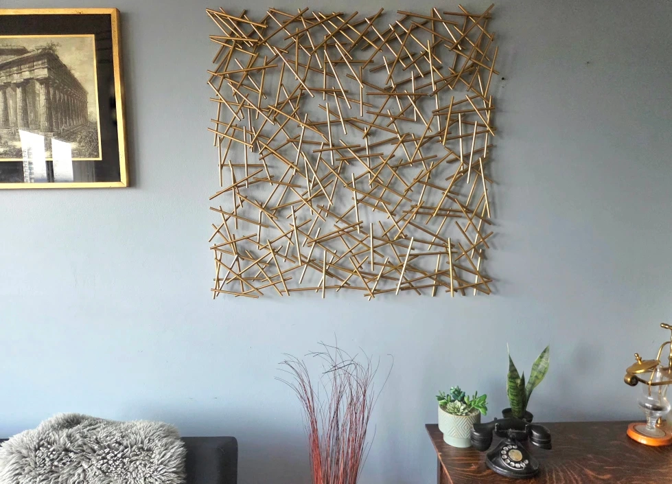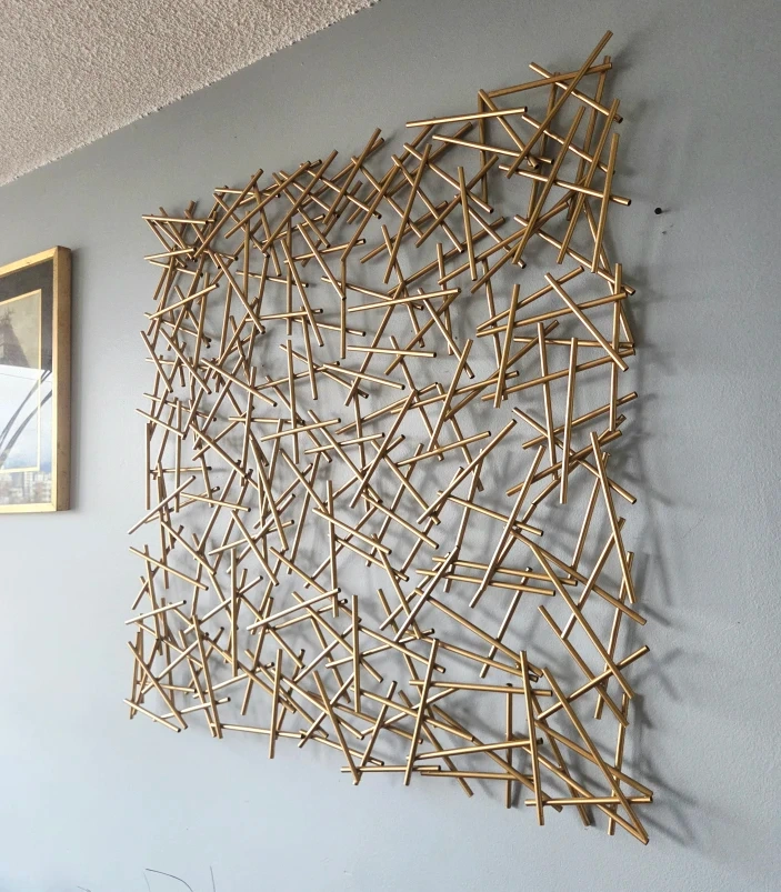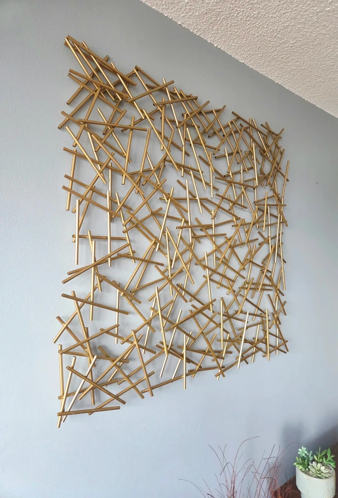 A stack of golden strands to add visual interest to your walls. Made of high-shine metal, it almost looks like a game of pick up sticks, but for the wall. Easy to hang for an instant update to your wall decor.