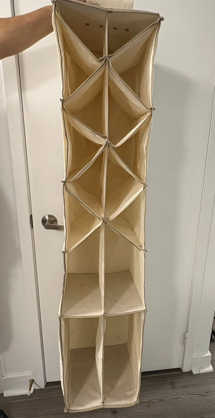 Selling a beige hanging closet organizer! It's perfect for maximizing space and keeping things tidy in your closet. Great for shoes, sweaters, or accessories.