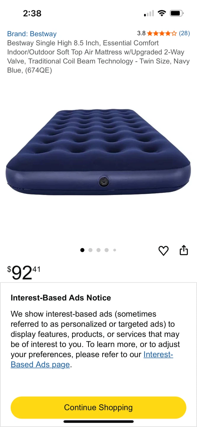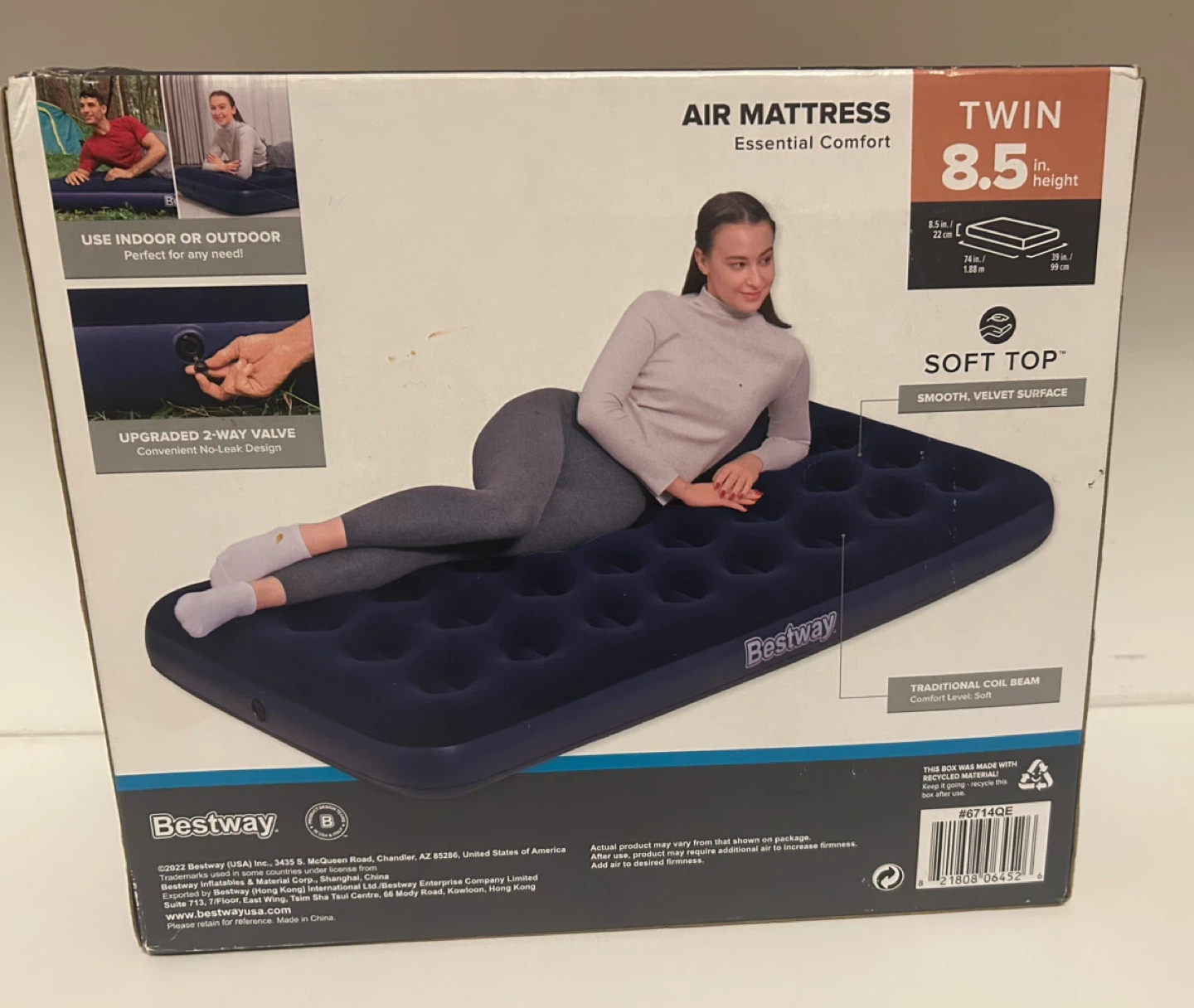 Selling a Bestway Twin Air Mattress in navy blue. It's the Essential Comfort model with a soft top. It's 8.5 inches in height, 74 inches long, and 39 inches wide. Perfect for indoor or outdoor use!