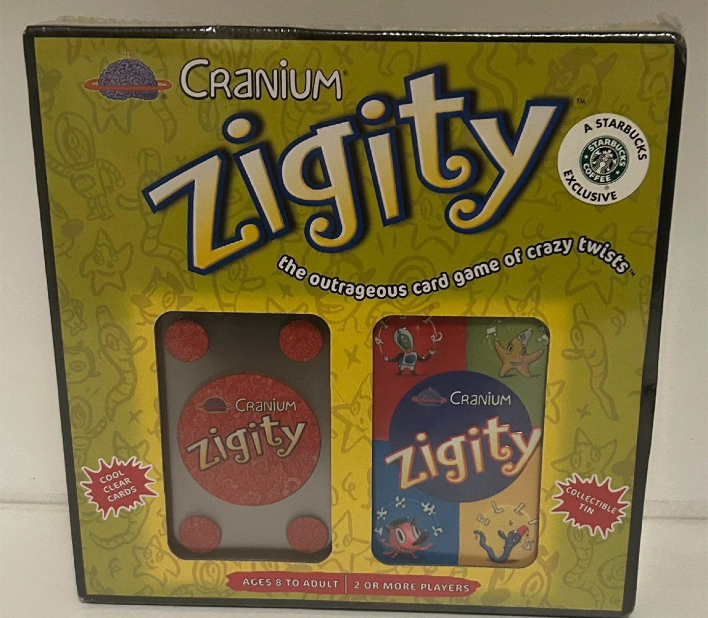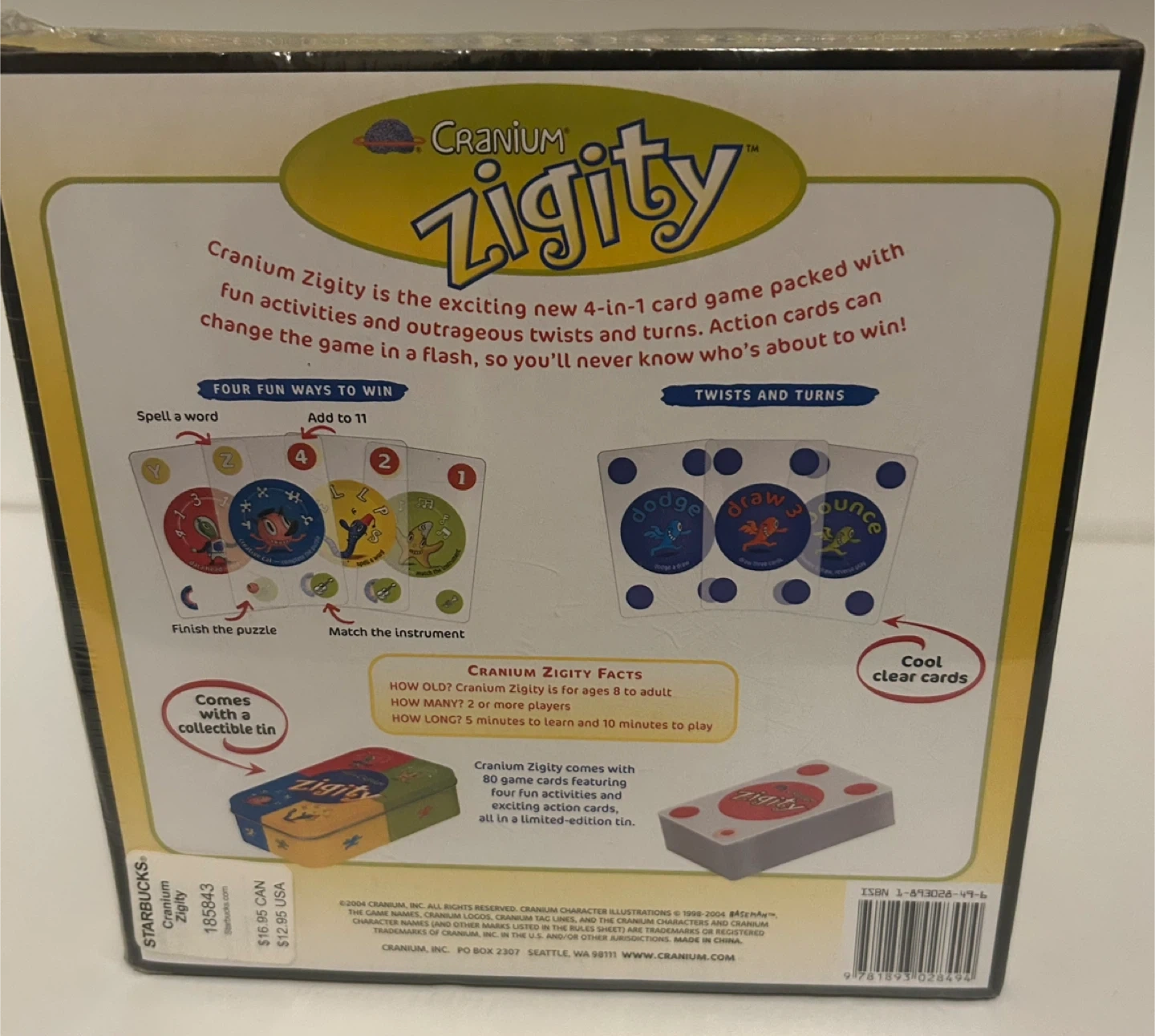 Selling a Cranium Zigity card game, a Starbucks exclusive! It's a fun 4-in-1 card game packed with activities and outrageous twists. Action cards can change the game in a flash, so you'll never know who's about to win! Comes with cool clear cards and a collectible tin. For ages 8 to adult, and 2 or more players. Originally sold for $16.95 CAN at Starbucks
