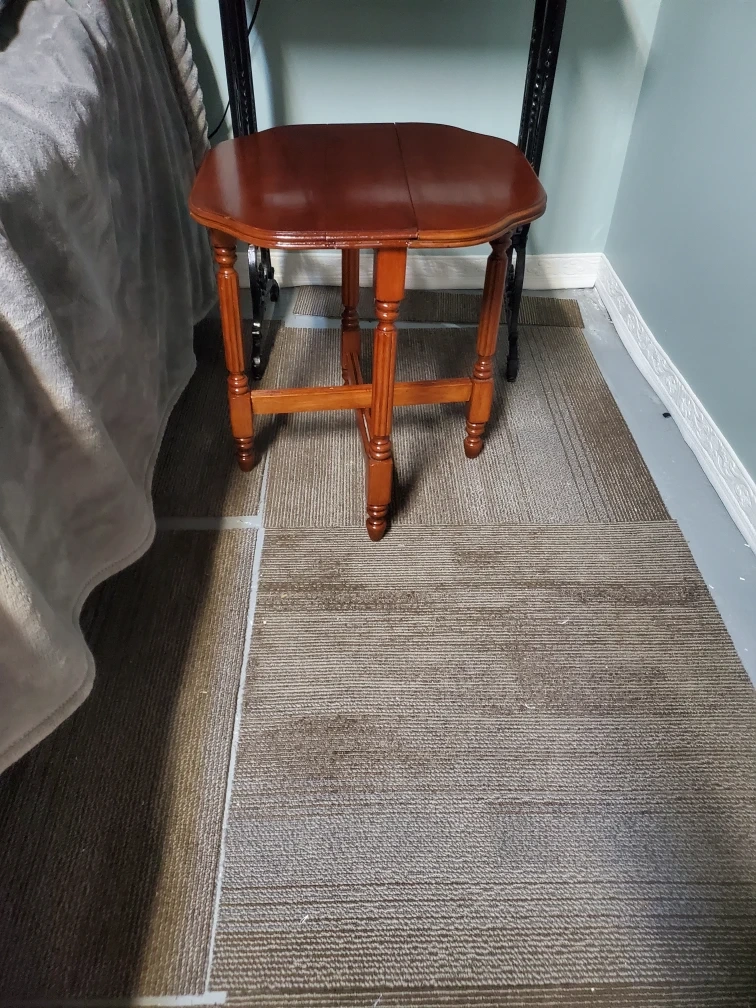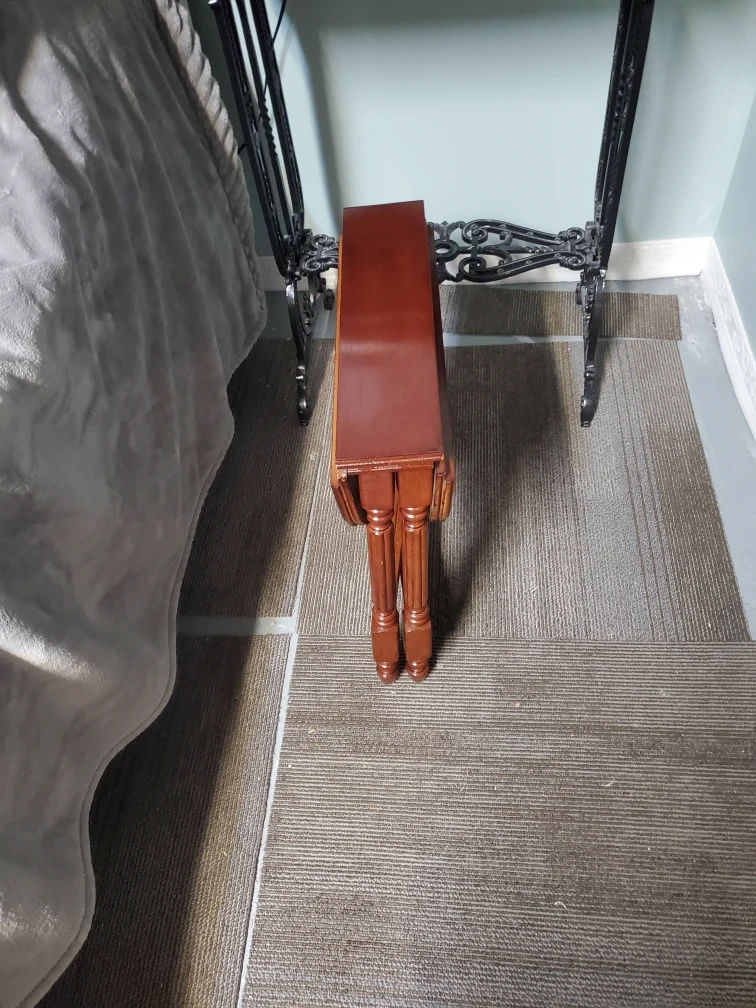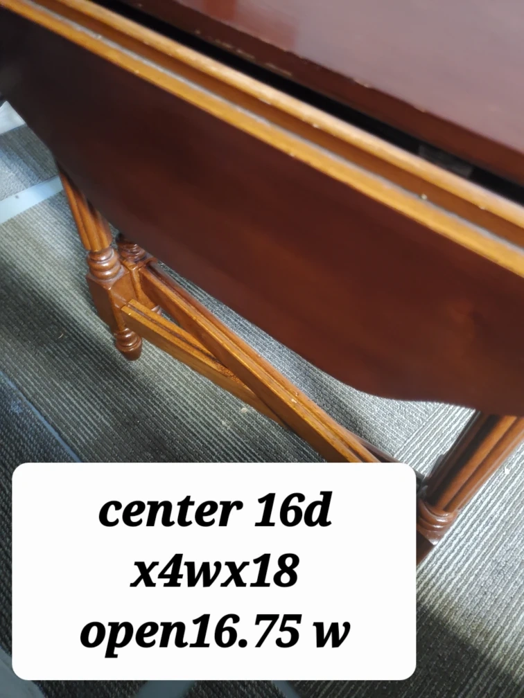 Selling a small drop leaf table. When folded, it's quite compact, but it opens up to be wider. It's a nice brown colour and would fit well in many spaces. Measurements when open are approximately 16.75 inches wide. This fits nicely in small spaces its very petit.