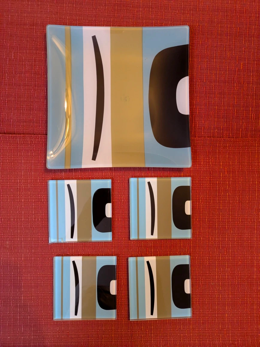 Selling a stylish glass tray and coaster set! The set features a modern design with blue, white, brown, and black accents. Perfect for adding a touch of elegance to your home decor