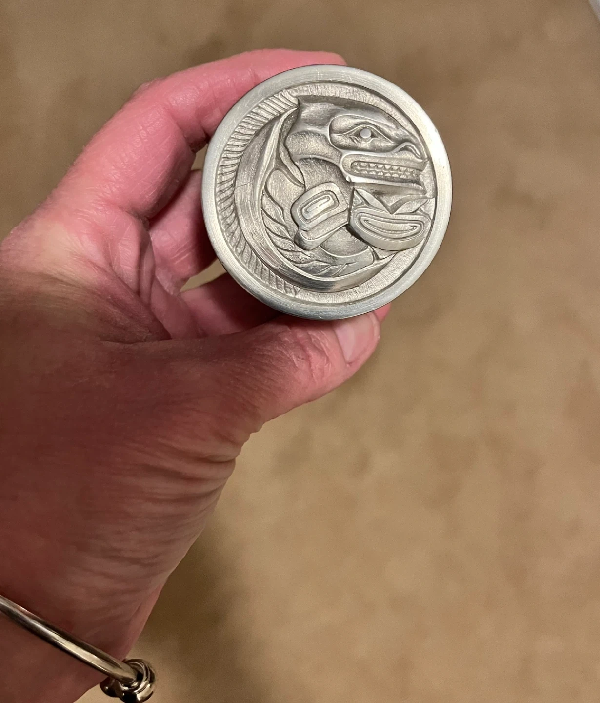 Vintage Boma First Nations pewter trinket box. It features intricate Northwest Coast Indigenous art designs around the sides and on the lid. Salmon Design on top lid