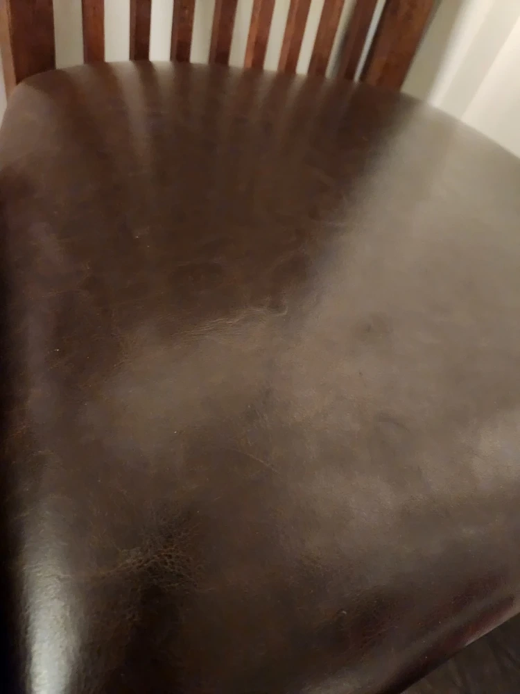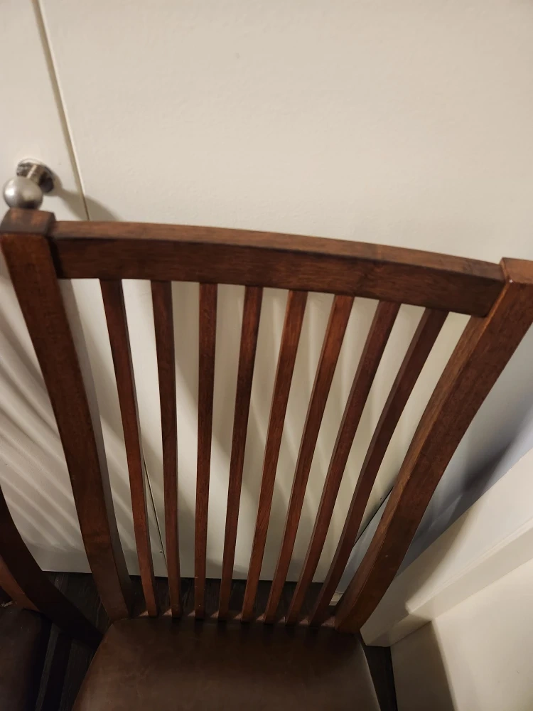 Selling a set of two wooden dining chairs. They have a dark brown finish and a leather seat. They're in good condition and would be a great addition to any dining room