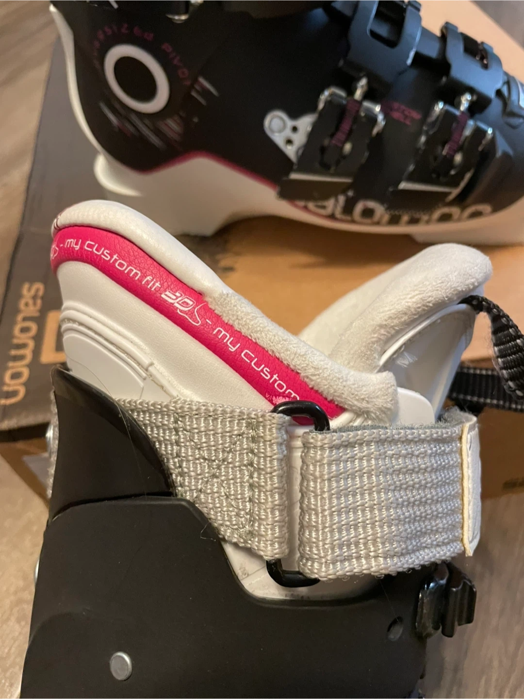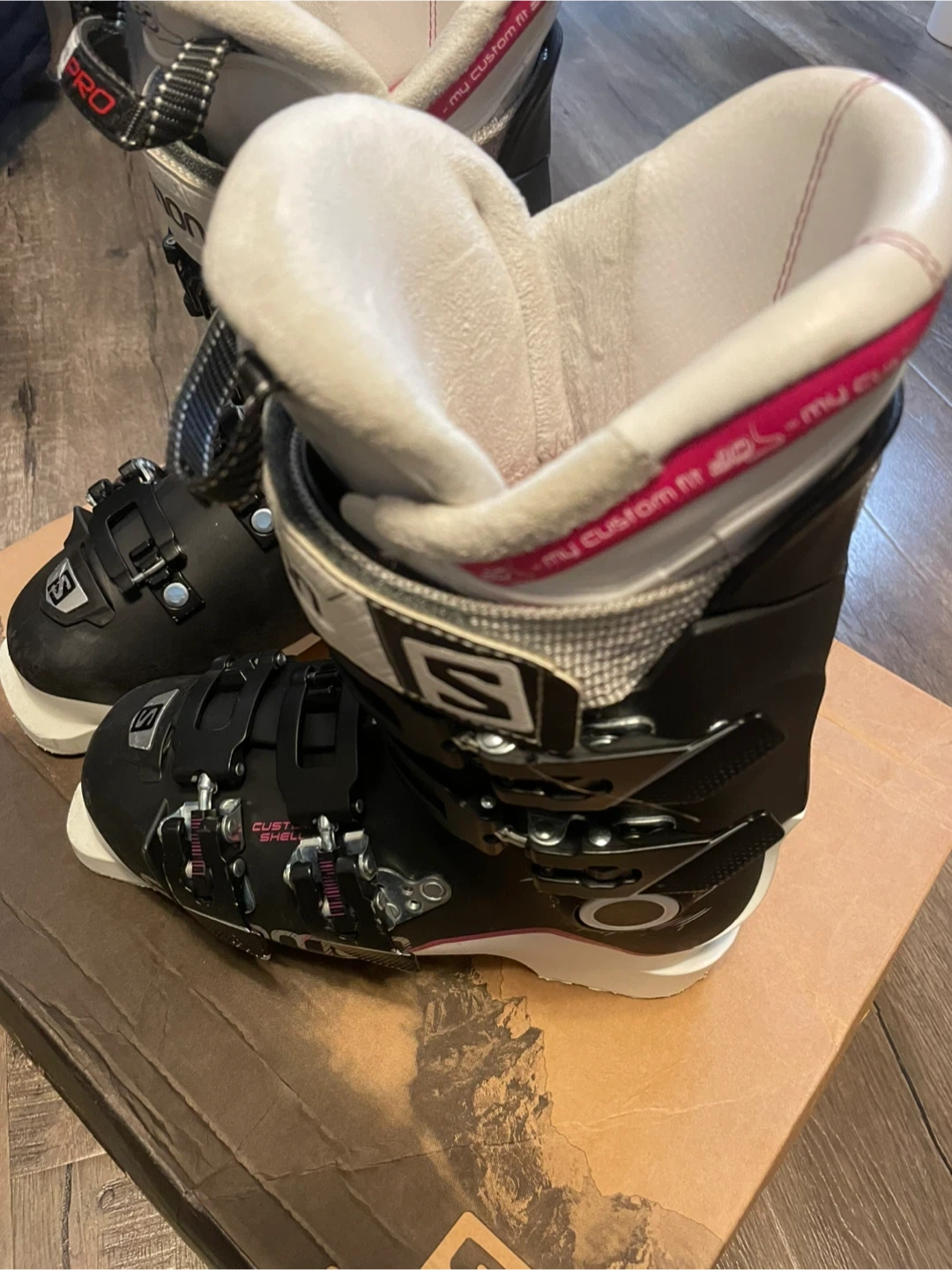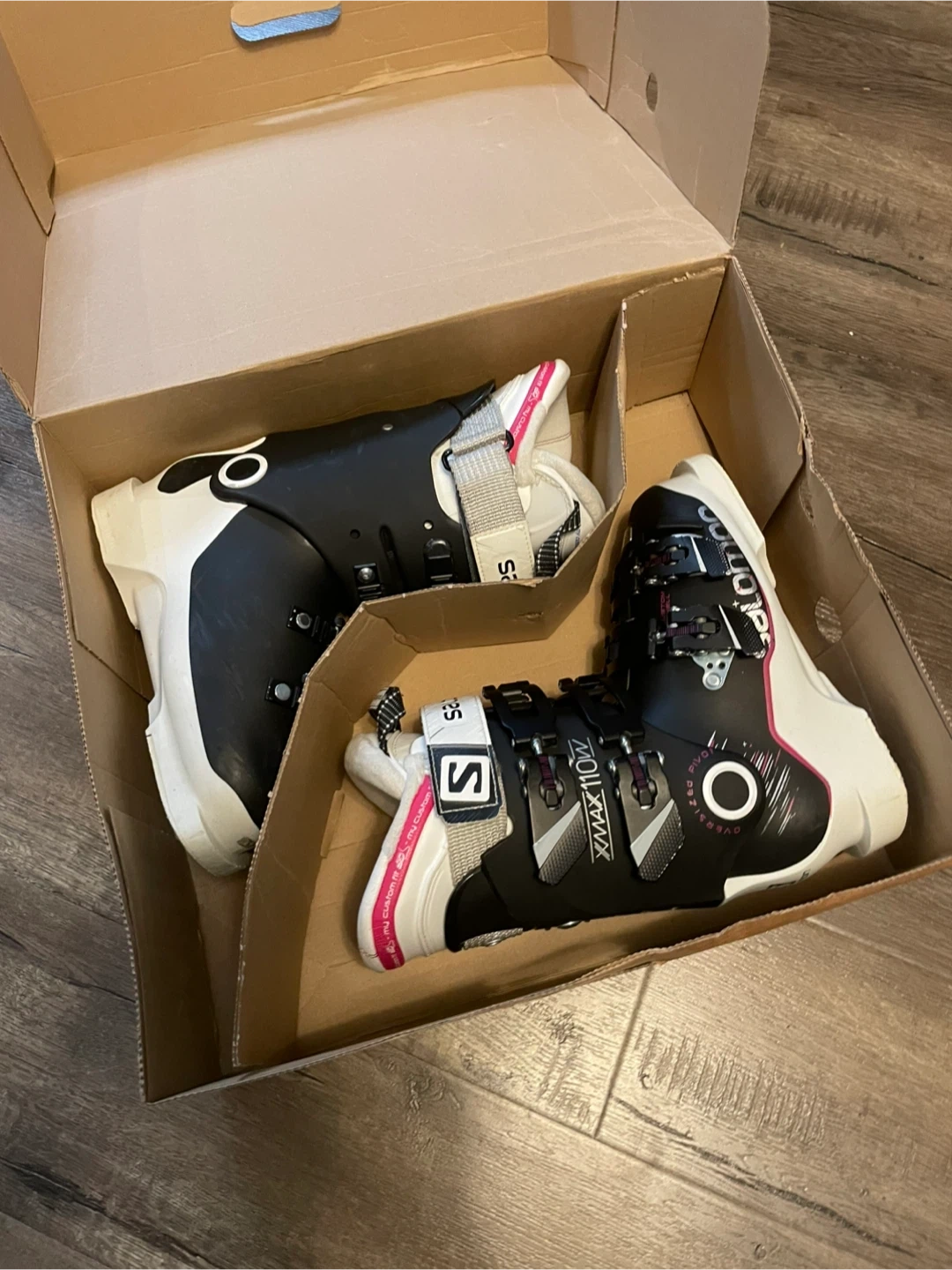 Selling a pair of Salomon X Max 110W ski boots in women's size 23.5. They come in their original box, ready for the slopes. These boots are black and white.