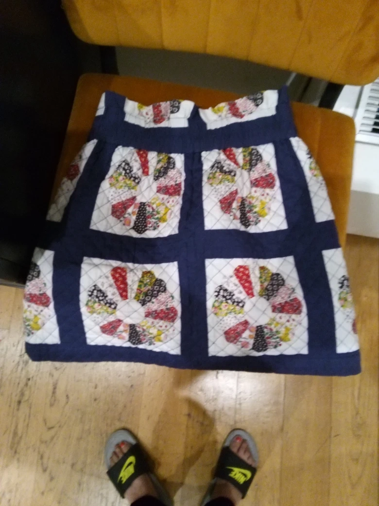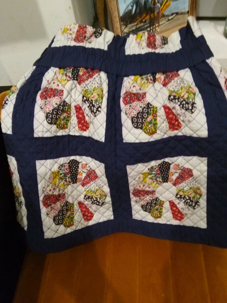 This is a handmade quilted skirt with a unique design. It features a patchwork of floral patterns in red, black, and yellow on a white background, framed by navy blue squares. This one-of-a-kind skirt is sure to add a touch of homespun charm to your wardrobe!