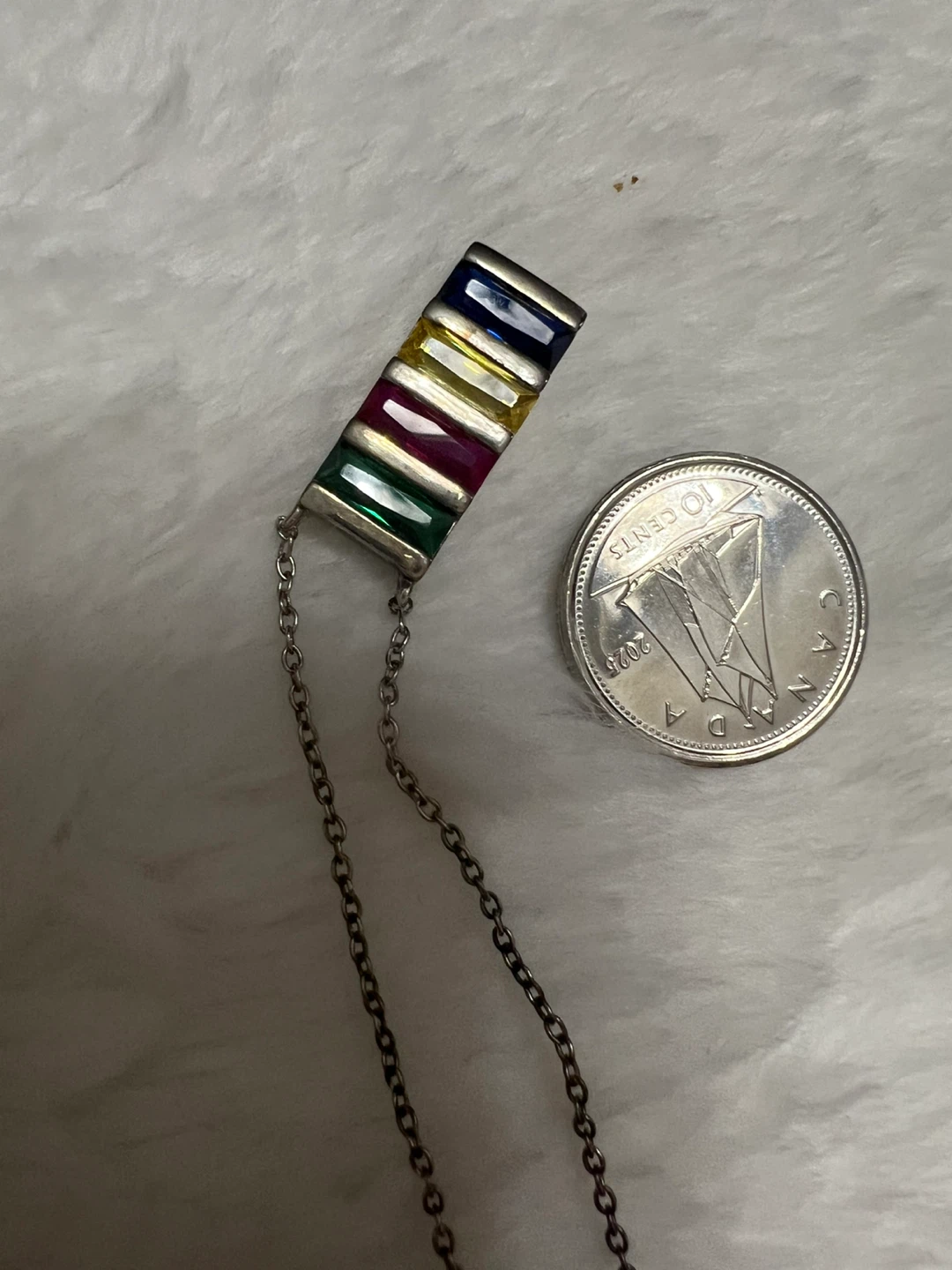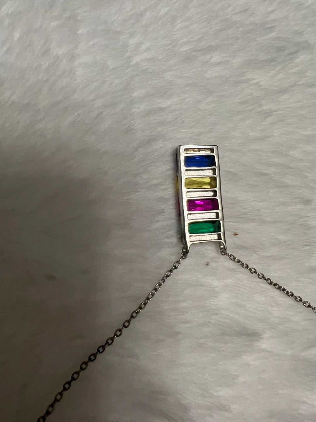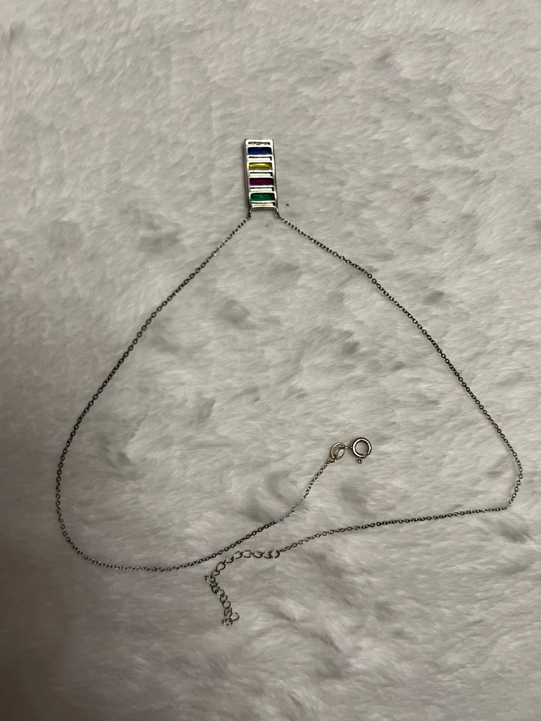 Selling a cute silver necklace with a rainbow-coloured pendant! The pendant is made of silver and has colourful stones. It's marked with '925', indicating its silver purity.