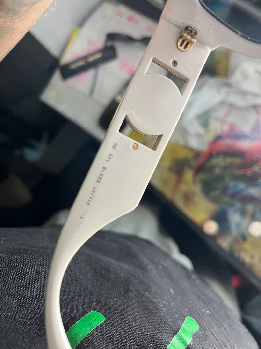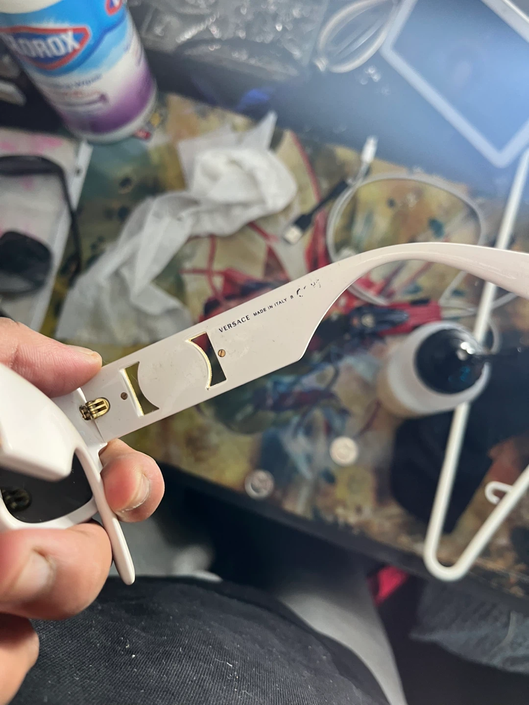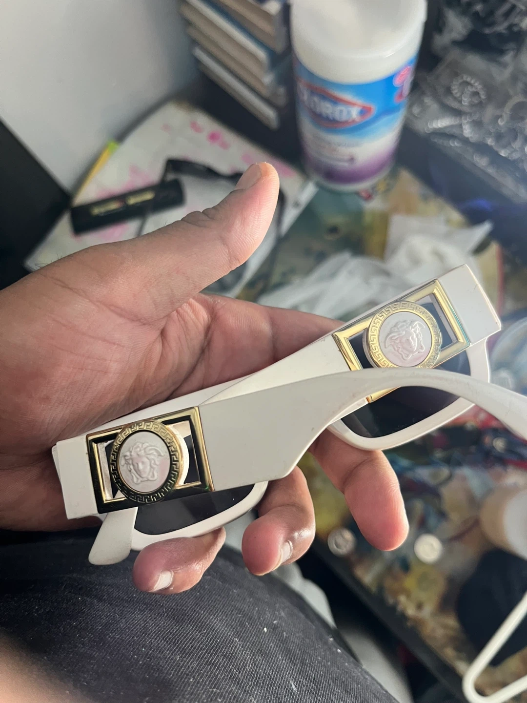 Selling a pair of Versace sunglasses in white. They have a unique design with gold accents. The sunglasses are marked with 'VERSACE MADE IN ITALY CE'.