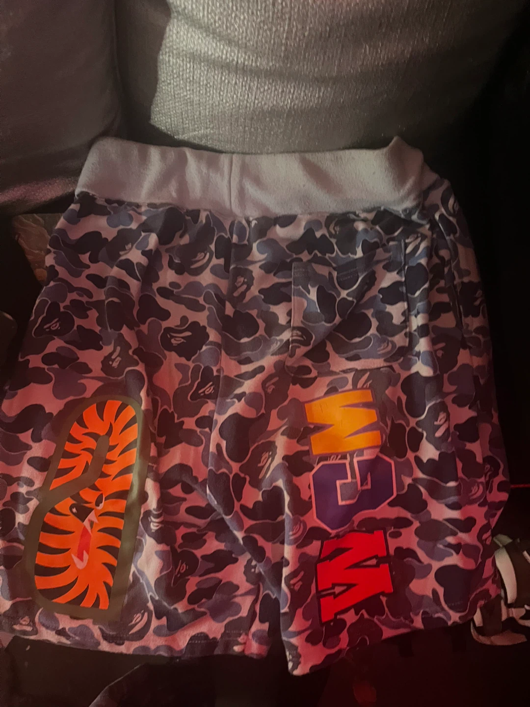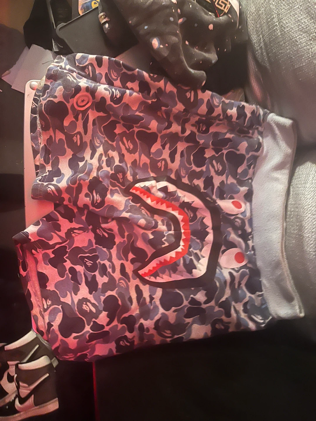 Selling a pair of BAPE camo shark shorts. The shorts feature a blue camo pattern with the iconic shark design. Perfect for casual wear!
