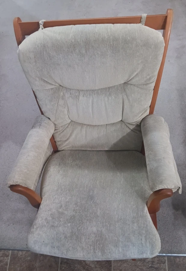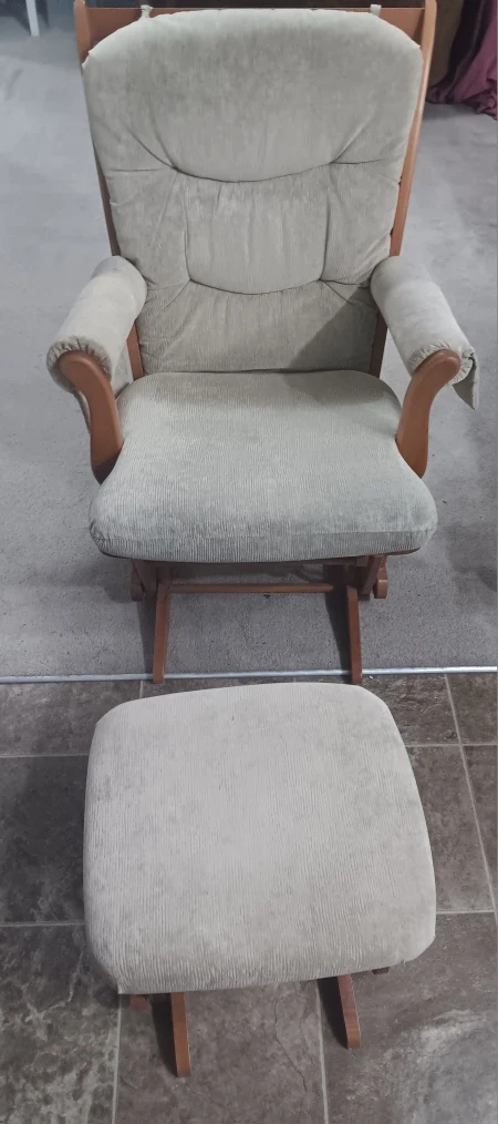 Selling a comfy glider rocking chair with a matching ottoman. It's in good condition and would be perfect for a nursery or living room. The chair and ottoman have a light-coloured fabric and a wooden frame.