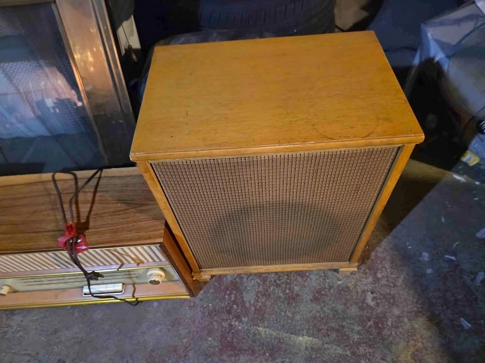 The prominent, larger wooden cabinet with the gridded fabric front is identified as a Jensen TF-4 speaker system. These were part of Jensen's "Slender Shelf" series, known for their compact design and high-fidelity sound for the era. The TF-4 was specifically a 4-way, 5-speaker system, featuring Jensen's "Flexair" technology. Jensen was a notable speaker manufacturer in the mid-20th century, known for producing their own drivers.