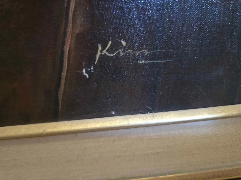 This is an oil painting titled "A Dark Knight in Toronto" by an artist who upcycles vintage paintings.