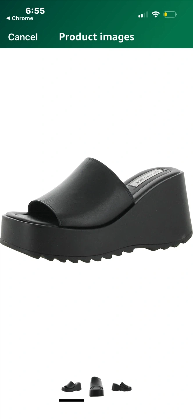 Check out these stylish black platform wedge sandals from Steve Madden! They're perfect for adding a bit of height and a trendy touch to any outfit. These sandals are sure to make a statement. Only worn once!
