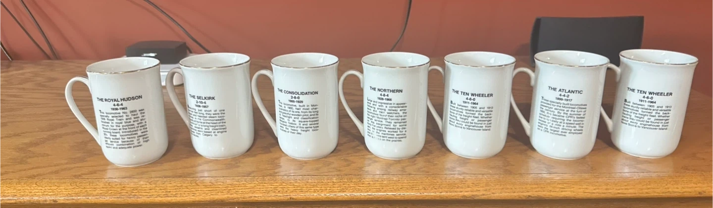 Selling a set of seven collectible train mugs. Each mug features a different classic locomotive design. These mugs would be a great addition to any train enthusiast's collection!