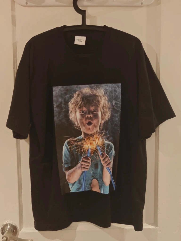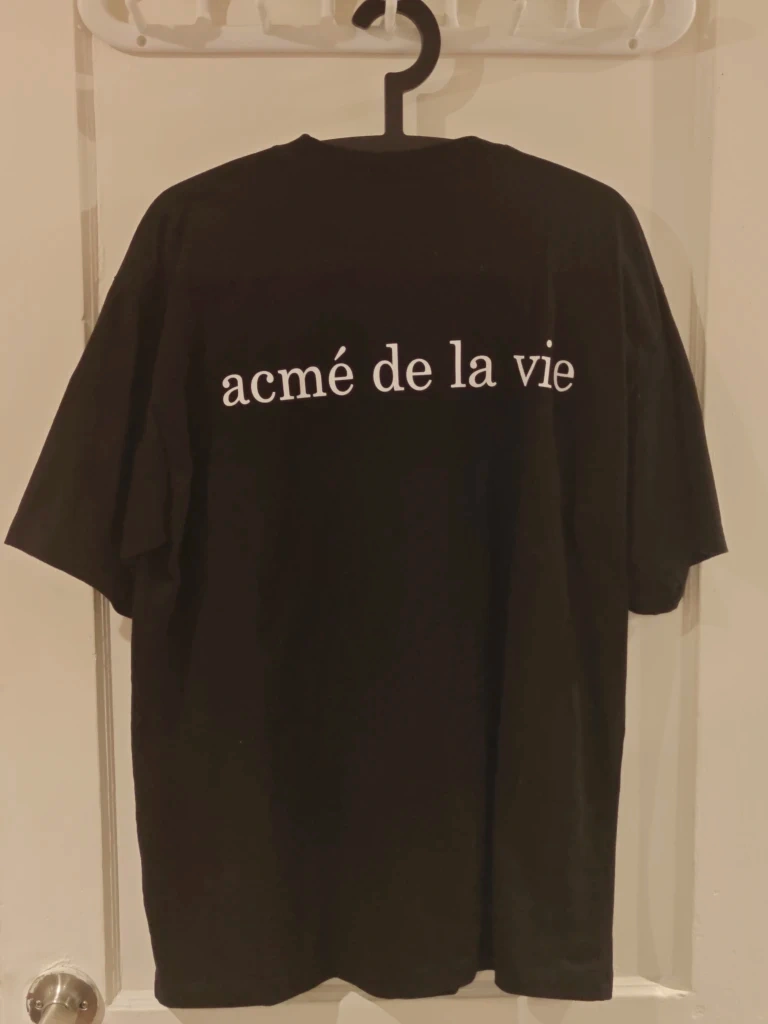 Selling an Acme De La Vie black t-shirt. The shirt features a unique design on the front and the brand name on the back. It's in great condition and ready for a new home!