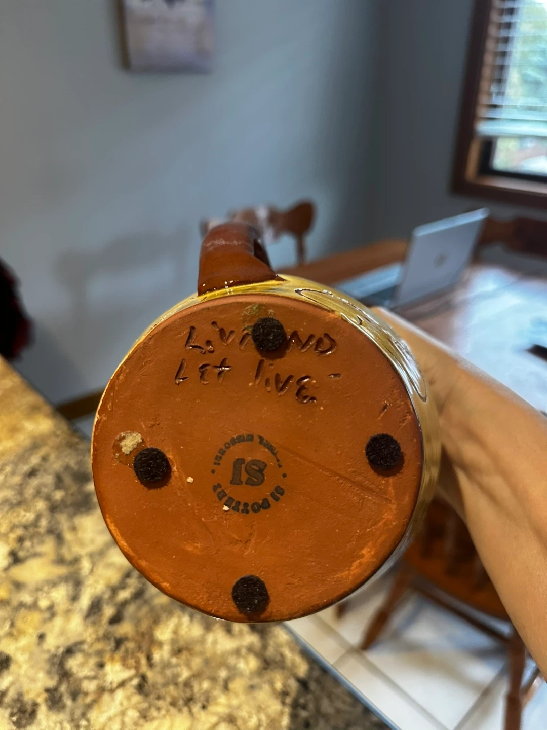 This is a lovely pottery pitcher featuring a charming chicken and floral design. It has a unique, rustic feel with the words "Leben und Leben Lassen" inscribed on the side, and "Live and Let Live" on the bottom. Perfect for adding a touch of folk art to your kitchen or dining area