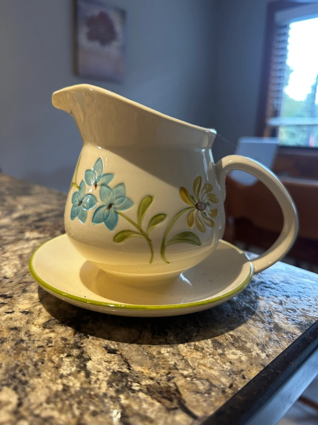 Selling a lovely Franciscan Earthenware creamer with a matching saucer! It features a charming floral design in blue and yellow. A sweet addition to any table setting or vintage collection