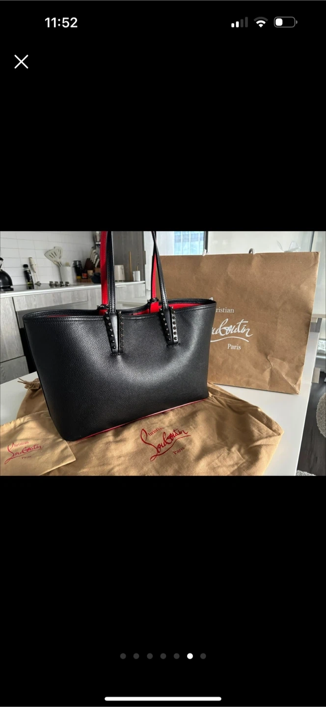 Looking to rehome this stylish Christian Louboutin tote bag! It features a sleek black leather exterior with vibrant red accents on the handles and interior. Comes with its original dust bag and a matching Louboutin pouch!
