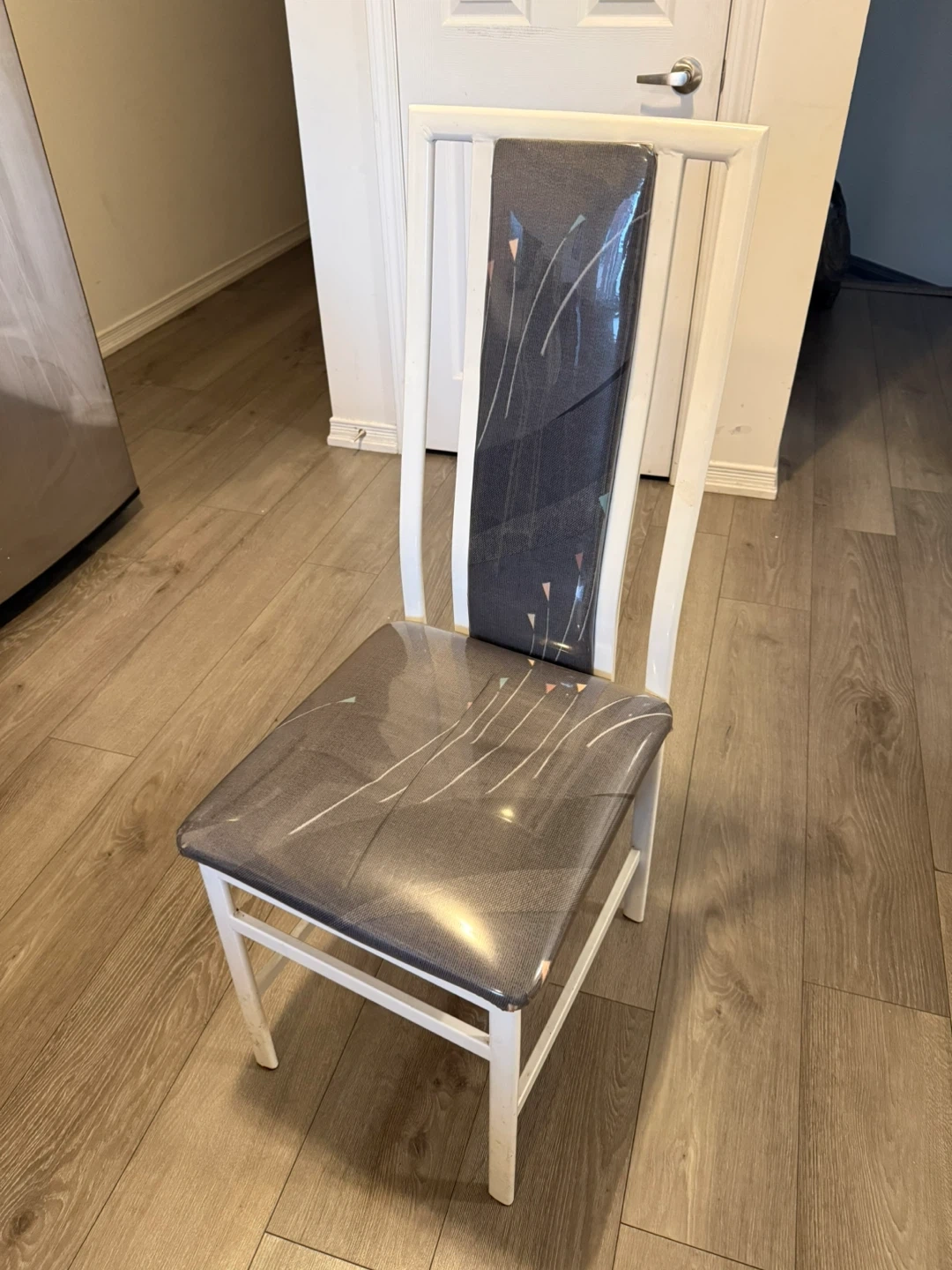 They have a white frame and a grey patterned seat and back.